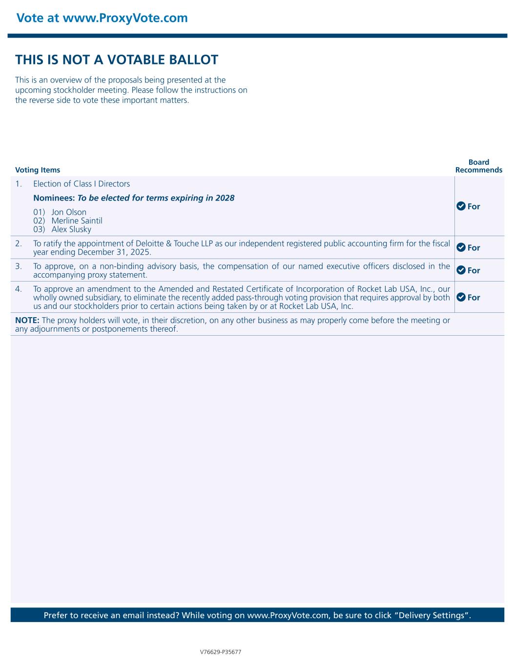THIS IS NOT A VOTABLE BALLOT This is an overview of the proposals being presented at the upcoming stockholder meeting. Please follow the instructions on the reverse side to vote these important matters. Vote at www.ProxyVote.com Prefer to receive an email instead? While voting on www.ProxyVote.com, be sure to click “Delivery Settings”. Voting Items Board Recommends V76629-P35677 1. Election of Class I Directors For Nominees: To be elected for terms expiring in 2028 01) Jon Olson 02) Merline Saintil 03) Alex Slusky 2. To ratify the appointment of Deloitte & Touche LLP as our independent registered public accounting firm for the fiscal year ending December 31, 2025. For 3. To approve, on a non-binding advisory basis, the compensation of our named executive officers disclosed in the accompanying proxy statement. For 4. To approve an amendment to the Amended and Restated Certificate of Incorporation of Rocket Lab USA, Inc., our wholly owned subsidiary, to eliminate the recently added pass-through voting provision that requires approval by both us and our stockholders prior to certain actions being taken by or at Rocket Lab USA, Inc. For NOTE: The proxy holders will vote, in their discretion, on any other business as may properly come before the meeting or any adjournments or postponements thereof.