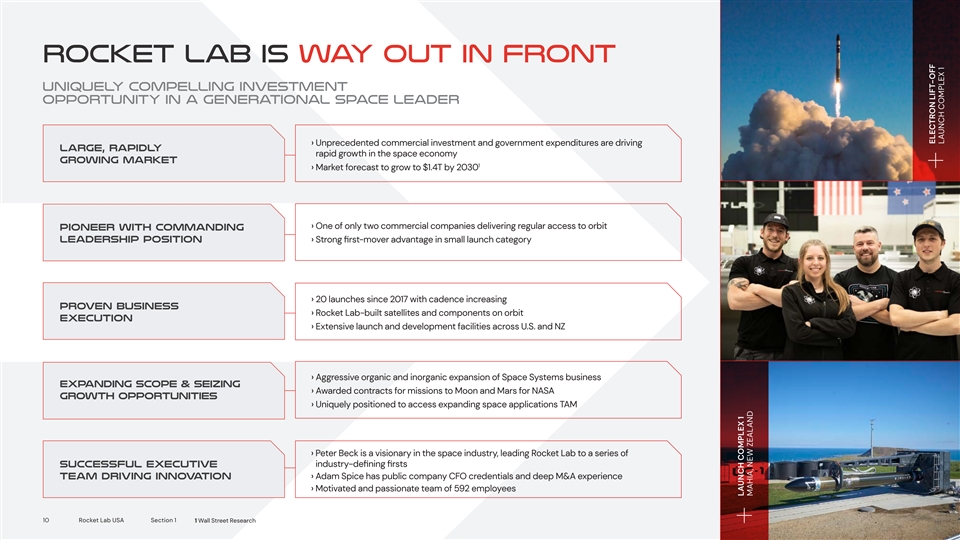 Rocket Lab is way out in front Uniquely compelling investment opportunity in a generational space leader › Unprecedented commercial investment and government expenditures are driving Large, Rapidly rapid growth in the space economy Growing Market 1 › M arket forecast to grow to $1.4T by 2030 › One of only two commercial companies delivering regular access to orbit Pioneer with Commanding Leadership Position › Strong first-mover advantage in small launch category › 20 launches since 2017 with cadence increasing Proven Business › Rocket Lab-built satellites and components on orbit Execution › Extensive launch and development facilities across U.S. and NZ › A ggressive organic and inorganic expansion of Space Systems business Expanding Scope & Seizing › Awarded contracts for missions to Moon and Mars for NASA Growth Opportunities › Uniquely positioned to access expanding space applications TAM › Peter Beck is a visionary in the space industry, leading Rocket Lab to a series of industry-deni fi ng r fi sts Successful Executive › Adam Spice has public company CFO credentials and deep M&A experience Team Driving Innovation › Motivated and passionate team of 592 employees 10 Rocket Lab USA Section 1 1 Wall Street Research LAUNCH COMPLEX 1 MAHIA, NEW ZEALAND ELECTRON LIFT-OFF LAUNCH COMPLEX 1 Rocket Lab is way out in front Uniquely compelling investment opportunity in a generational space leader › Unprecedented commercial investment and government expenditures are driving Large, Rapidly rapid growth in the space economy Growing Market 1 › M arket forecast to grow to $1.4T by 2030 › One of only two commercial companies delivering regular access to orbit Pioneer with Commanding Leadership Position › Strong first-mover advantage in small launch category › 20 launches since 2017 with cadence increasing Proven Business › Rocket Lab-built satellites and components on orbit Execution › Extensive launch and development facilities across U.S. and NZ › A ggressive organic and inorganic expansion of Space Systems business Expanding Scope & Seizing › Awarded contracts for missions to Moon and Mars for NASA Growth Opportunities › Uniquely positioned to access expanding space applications TAM › Peter Beck is a visionary in the space industry, leading Rocket Lab to a series of industry-deni fi ng r fi sts Successful Executive › Adam Spice has public company CFO credentials and deep M&A experience Team Driving Innovation › Motivated and passionate team of 592 employees 10 Rocket Lab USA Section 1 1 Wall Street Research LAUNCH COMPLEX 1 MAHIA, NEW ZEALAND ELECTRON LIFT-OFF LAUNCH COMPLEX 1