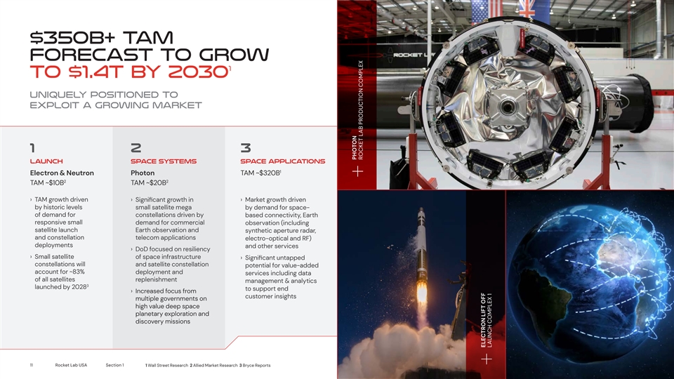 $350B+ TAM forecast to grow 1 to $1.4T by 2030 Uniquely positioned to exploit a growing market 1 2 3 Launch SPACE SYSTEMS SPACE APPLICATIONS 1 Electron & Neutron Photon TAM ~$320B 2 2 TAM ~$10B TAM ~$20B › TAM growth driven › S ignic fi ant growth in › Market growth driven by historic levels small satellite mega by demand for space- of demand for constellations driven by based connectivity, Earth responsive small demand for commercial observation (including satellite launch Earth observation and synthetic aperture radar, and constellation telecom applications electro-optical and RF) deployments and other services › DoD focused on resiliency › Small satellite of space infrastructure › S ignic fi ant untapped constellations will and satellite constellation potential for value-added account for ~83% deployment and services including data of all satellites replenishment management & analytics 3 launched by 2028 to support end › I ncreased focus from customer insights multiple governments on high value deep space planetary exploration and discovery missions 11 Rocket Lab USA Section 1 1 Wall Street Research 2 Allied Market Research 3 Bryce Reports PHOTON ROCKET LAB PRODUCTION COMPLEX ELECTRON LIFT OFF LAUNCH COMPLEX 1$350B+ TAM forecast to grow 1 to $1.4T by 2030 Uniquely positioned to exploit a growing market 1 2 3 Launch SPACE SYSTEMS SPACE APPLICATIONS 1 Electron & Neutron Photon TAM ~$320B 2 2 TAM ~$10B TAM ~$20B › TAM growth driven › S ignic fi ant growth in › Market growth driven by historic levels small satellite mega by demand for space- of demand for constellations driven by based connectivity, Earth responsive small demand for commercial observation (including satellite launch Earth observation and synthetic aperture radar, and constellation telecom applications electro-optical and RF) deployments and other services › DoD focused on resiliency › Small satellite of space infrastructure › S ignic fi ant untapped constellations will and satellite constellation potential for value-added account for ~83% deployment and services including data of all satellites replenishment management & analytics 3 launched by 2028 to support end › I ncreased focus from customer insights multiple governments on high value deep space planetary exploration and discovery missions 11 Rocket Lab USA Section 1 1 Wall Street Research 2 Allied Market Research 3 Bryce Reports PHOTON ROCKET LAB PRODUCTION COMPLEX ELECTRON LIFT OFF LAUNCH COMPLEX 1