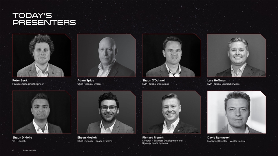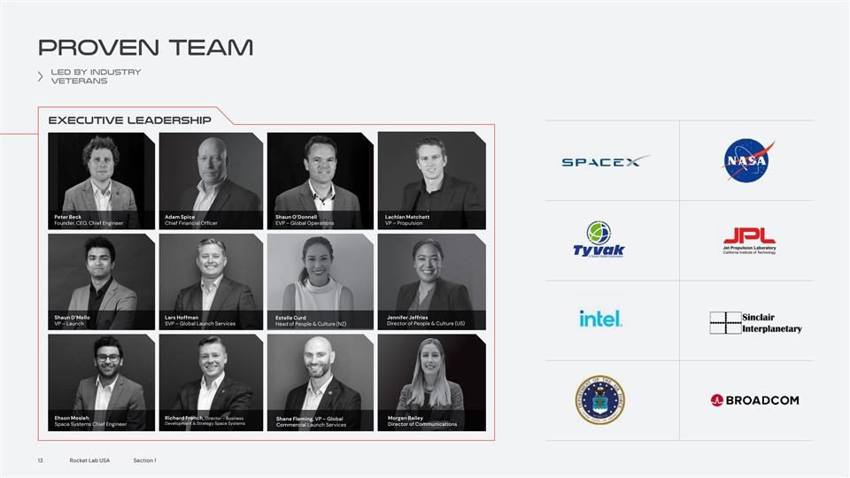 PROVEN TEAM led by industry veterans EXECUTIVE LEADERSHIP Peter Beck Adam Spice Shaun O’Donnell Lachlan Matchett Founder, CEO, Chief Engineer Chief Financial Officer EVP – Global Operations VP – Propulsion Shaun D’Mello Lars Hoffman Estelle Curd Jennifer Jeffries Director of People & Culture (US) VP – Launch SVP – Global Launch Services Head of People & Culture (NZ) Ehson Mosleh Richard French, Director – Business Morgan Bailey Shane Fleming, VP – Global Development & Strategy Space Systems Space Systems Chief Engineer Director of Communications Commercial Launch Services 13 Rocket Lab USA Section 1PROVEN TEAM led by industry veterans EXECUTIVE LEADERSHIP Peter Beck Adam Spice Shaun O’Donnell Lachlan Matchett Founder, CEO, Chief Engineer Chief Financial Officer EVP – Global Operations VP – Propulsion Shaun D’Mello Lars Hoffman Estelle Curd Jennifer Jeffries Director of People & Culture (US) VP – Launch SVP – Global Launch Services Head of People & Culture (NZ) Ehson Mosleh Richard French, Director – Business Morgan Bailey Shane Fleming, VP – Global Development & Strategy Space Systems Space Systems Chief Engineer Director of Communications Commercial Launch Services 13 Rocket Lab USA Section 1