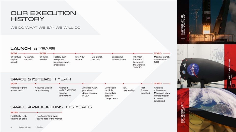 Our execution history We do what we say we will do Launch 6 YEARS 2014 2018 2020 1st venture NZ launch 1st flight Factory built First NRO U.S. launch Successful 4th most Monthly launch capital site built to orbit to support 1 launch site built reuse mission frequent cadence into raised rocket per week launcher in 2021 production the world in ‘19 & ‘20 Space Systems 1 YEAR 2019 2020 Photon program Acquired Sinclair Awarded Awarded NASA Developed KSAT First Awarded announced Interplanetary NASA CAPSTONE propellant multiple partnership Photon missions to mission depot mission Rocket Lab launched Moon and Mars. to the Moon in LEO satellite Private mission components to Venus scheduled Space Applications 0.5 YEARS 2020 First Rocket Lab Positioned to provide satellite on orbit space data to the market 14 Rocket Lab USA Section 1 PHOTON FIRST LIGHT ELECTRON LIFT-OFF NOVEMBER 2020 MAHIA, NEW ZEALAND FIRST NASA MISSION 2018Our execution history We do what we say we will do Launch 6 YEARS 2014 2018 2020 1st venture NZ launch 1st flight Factory built First NRO U.S. launch Successful 4th most Monthly launch capital site built to orbit to support 1 launch site built reuse mission frequent cadence into raised rocket per week launcher in 2021 production the world in ‘19 & ‘20 Space Systems 1 YEAR 2019 2020 Photon program Acquired Sinclair Awarded Awarded NASA Developed KSAT First Awarded announced Interplanetary NASA CAPSTONE propellant multiple partnership Photon missions to mission depot mission Rocket Lab launched Moon and Mars. to the Moon in LEO satellite Private mission components to Venus scheduled Space Applications 0.5 YEARS 2020 First Rocket Lab Positioned to provide satellite on orbit space data to the market 14 Rocket Lab USA Section 1 PHOTON FIRST LIGHT ELECTRON LIFT-OFF NOVEMBER 2020 MAHIA, NEW ZEALAND FIRST NASA MISSION 2018