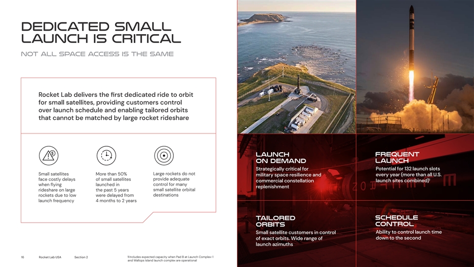 dedicated small launch is critical Not all space access is the same Rocket Lab delivers the first dedicated ride to orbit for small satellites, providing customers control over launch schedule and enabling tailored orbits that cannot be matched by large rocket rideshare Frequent Launch launch On demand Strategically critical for Potential for 132 launch slots Large rockets do not Small satellites More than 50% military space resilience and every year (more than all U.S. provide adequate 1 face costly delays of small satellites commercial constellation launch sites combined) when flying launched in control for many replenishment rideshare on large the past 5 years small satellite orbital rockets due to low were delayed from destinations launch frequency 4 months to 2 years SCHEDULE Tailored CONTROL orbits Small satellite customers in control Ability to control launch time of exact orbits. Wide range of down to the second launch azimuths 16 Rocket Lab USA Section 2 1 Includes expected capacity when Pad B at Launch Complex-1 and Wallops Island launch complex are operationaldedicated small launch is critical Not all space access is the same Rocket Lab delivers the first dedicated ride to orbit for small satellites, providing customers control over launch schedule and enabling tailored orbits that cannot be matched by large rocket rideshare Frequent Launch launch On demand Strategically critical for Potential for 132 launch slots Large rockets do not Small satellites More than 50% military space resilience and every year (more than all U.S. provide adequate 1 face costly delays of small satellites commercial constellation launch sites combined) when flying launched in control for many replenishment rideshare on large the past 5 years small satellite orbital rockets due to low were delayed from destinations launch frequency 4 months to 2 years SCHEDULE Tailored CONTROL orbits Small satellite customers in control Ability to control launch time of exact orbits. Wide range of down to the second launch azimuths 16 Rocket Lab USA Section 2 1 Includes expected capacity when Pad B at Launch Complex-1 and Wallops Island launch complex are operational