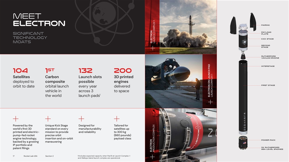 Meet Fairing electron Payload plate SIGNIFICANT technology Kick stage moats SECOND stage RUTHERFORD VACUUM ENGINE INTERSTAGE st 104 1 132 200 Satellites Carbon Launch slots 3D printed deployed to composite possible engines FIRST STAGE orbit to date orbital launch every year delivered vehicle in across 3 to space 1 the world launch pads Powered by the Unique Kick Stage Designed for Tailored for world’s first 3D standard on every manufacturability satellites up printed and electric- mission to provide and reliability to 300 kg pump-fed rocket precise orbit (660 pounds) engine technology, insertion and on-orbit payload class Power Pack backed by a growing maneuvering IP portfolio and 9x Rutherford patent filings Sea Level Engines 17 Rocket Lab USA Section 2 1 Includes expected capacity when Pad B at Launch Complex-1 and Wallops Island launch complex are operational ELECTRON ELECTRON PRODUCTION COMPLEX LAUNCH COMPLEX 1 ELECTRON ON LAUNCH PAD LAUNCH COMPLEX 1Meet Fairing electron Payload plate SIGNIFICANT technology Kick stage moats SECOND stage RUTHERFORD VACUUM ENGINE INTERSTAGE st 104 1 132 200 Satellites Carbon Launch slots 3D printed deployed to composite possible engines FIRST STAGE orbit to date orbital launch every year delivered vehicle in across 3 to space 1 the world launch pads Powered by the Unique Kick Stage Designed for Tailored for world’s first 3D standard on every manufacturability satellites up printed and electric- mission to provide and reliability to 300 kg pump-fed rocket precise orbit (660 pounds) engine technology, insertion and on-orbit payload class Power Pack backed by a growing maneuvering IP portfolio and 9x Rutherford patent filings Sea Level Engines 17 Rocket Lab USA Section 2 1 Includes expected capacity when Pad B at Launch Complex-1 and Wallops Island launch complex are operational ELECTRON ELECTRON PRODUCTION COMPLEX LAUNCH COMPLEX 1 ELECTRON ON LAUNCH PAD LAUNCH COMPLEX 1