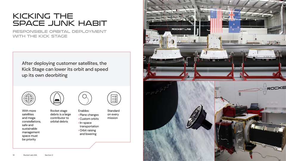 Kicking The Space Junk Habit Responsible orbital deployment with the Kick Stage After deploying customer satellites, the Kick Stage can lower its orbit and speed up its own deorbiting With more Rocket stage Enables: Standard satellites debris is a large on every › Plane changes and mega contributor to mission › Custom orbits constellations, orbital debris › In-space safe and transportation sustainable › Orbit raising management and lowering space must be priority 18 Rocket Lab USA Section 2Kicking The Space Junk Habit Responsible orbital deployment with the Kick Stage After deploying customer satellites, the Kick Stage can lower its orbit and speed up its own deorbiting With more Rocket stage Enables: Standard satellites debris is a large on every › Plane changes and mega contributor to mission › Custom orbits constellations, orbital debris › In-space safe and transportation sustainable › Orbit raising management and lowering space must be priority 18 Rocket Lab USA Section 2