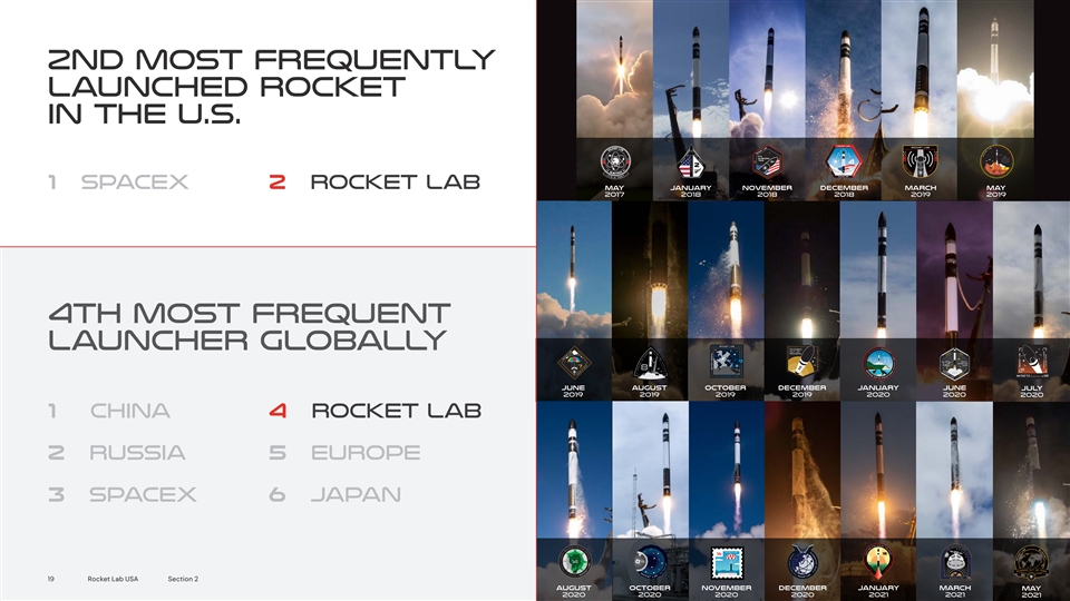 α - X i r t S | e v i t c e p s n y S r o c k 2nd most frequently launched rocket in the U.S. 5 1 SPACEX 2 ROCKET LAB MAY JANUARY NOVEMBER DECEMBER MARCH MAY 2017 2018 2018 2018 2019 2019 4th most frequent launcher globally JUNE AUGUST OCTOBER DECEMBER JANUARY JUNE JULY 2019 2019 2019 2019 2020 2020 2020 1 CHINA 4 ROCKET LAB 2 RUSSIA 5 EUROPE 3 SPACEX 6 JAPAN 19 Rocket Lab USA Section 2 AUGUST OCTOBER NOVEMBER DECEMBER JANUARY MARCH MAY 2020 2020 2020 2020 2021 2021 2021 e t l a b s n i g e b t h g i n s ' l w o e h T α - X i r t S | e v i t c e p s n y S r o c k 2nd most frequently launched rocket in the U.S. 5 1 SPACEX 2 ROCKET LAB MAY JANUARY NOVEMBER DECEMBER MARCH MAY 2017 2018 2018 2018 2019 2019 4th most frequent launcher globally JUNE AUGUST OCTOBER DECEMBER JANUARY JUNE JULY 2019 2019 2019 2019 2020 2020 2020 1 CHINA 4 ROCKET LAB 2 RUSSIA 5 EUROPE 3 SPACEX 6 JAPAN 19 Rocket Lab USA Section 2 AUGUST OCTOBER NOVEMBER DECEMBER JANUARY MARCH MAY 2020 2020 2020 2020 2021 2021 2021 e t l a b s n i g e b t h g i n s ' l w o e h T