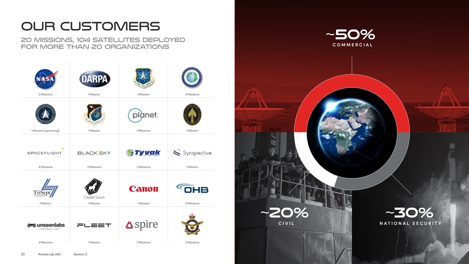 Our customers ~50% 20 missions, 104 satellites deployed C O M M E R C IAL for more than 20 organizations 2 Missions 1 Mission 1 Mission 2 Missions 1 Mission (upcoming) 1 Mission 3 Missions 1 Mission 4 Missions 2 Missions 3 Missions 1 Mission 1 Mission 1 Mission 1 Mission 2 Missions ~20% ~30% C I VI L NAT I O NAL S E C U R I T Y 2 Missions 1 Mission 2 Missions 2 Missions 20 Rocket Lab USA Section 2Our customers ~50% 20 missions, 104 satellites deployed C O M M E R C IAL for more than 20 organizations 2 Missions 1 Mission 1 Mission 2 Missions 1 Mission (upcoming) 1 Mission 3 Missions 1 Mission 4 Missions 2 Missions 3 Missions 1 Mission 1 Mission 1 Mission 1 Mission 2 Missions ~20% ~30% C I VI L NAT I O NAL S E C U R I T Y 2 Missions 1 Mission 2 Missions 2 Missions 20 Rocket Lab USA Section 2