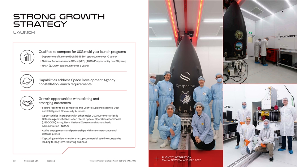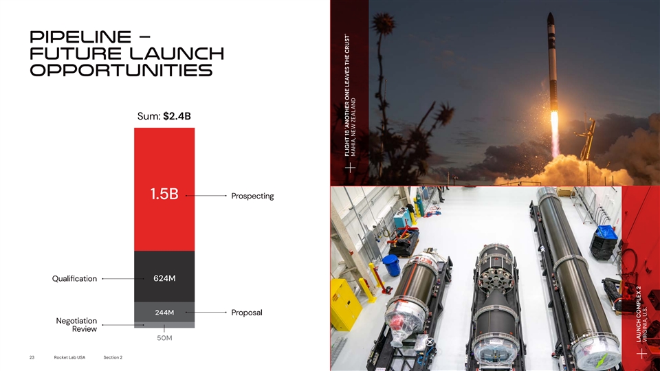 Strong growth strategy Launch Qualie fi d to compete for USG multi year launch programs › D epartment of Defense (DoD) ($968M* opportunity over 10 years) › National Reconnaissance Ofc fi e (NRO) ($700M* opportunity over 10 years) › NASA ($300M* opportunity over 5 years) Capabilities address Space Development Agency constellation launch requirements G rowth opportunities with existing and emerging customers › Secure facility to be completed this year to support classified DoD and Intelligence Community business › O pportunities in progress with other major USG customers Missile Defense Agency (MDA), United States Special Operations Command (USSOCOM), Army, Navy, National Oceanic and Atmospheric Administration ( NOAA) › A ctive engagements and partnerships with major aerospace and defense primes › C apturing early launches for startup commercial satellite companies leading to long term recurring business FLIGHT 17, INTEGRATION MAHIA, NEW ZEALAND, DEC 2020 22 Rocket Lab USA Section 2 *Source: Publicly available NASA, DoD and NASA RFPsStrong growth strategy Launch Qualie fi d to compete for USG multi year launch programs › D epartment of Defense (DoD) ($968M* opportunity over 10 years) › National Reconnaissance Ofc fi e (NRO) ($700M* opportunity over 10 years) › NASA ($300M* opportunity over 5 years) Capabilities address Space Development Agency constellation launch requirements G rowth opportunities with existing and emerging customers › Secure facility to be completed this year to support classified DoD and Intelligence Community business › O pportunities in progress with other major USG customers Missile Defense Agency (MDA), United States Special Operations Command (USSOCOM), Army, Navy, National Oceanic and Atmospheric Administration ( NOAA) › A ctive engagements and partnerships with major aerospace and defense primes › C apturing early launches for startup commercial satellite companies leading to long term recurring business FLIGHT 17, INTEGRATION MAHIA, NEW ZEALAND, DEC 2020 22 Rocket Lab USA Section 2 *Source: Publicly available NASA, DoD and NASA RFPs