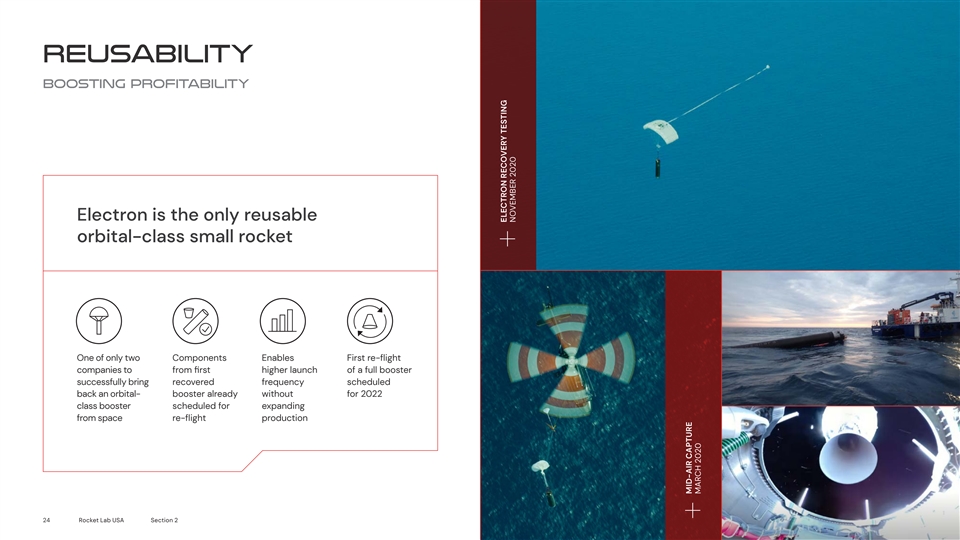 REUSABILITY Boosting profitability Electron is the only reusable orbital-class small rocket One of only two Components Enables First re-flight companies to from first higher launch of a full booster successfully bring recovered frequency scheduled back an orbital- booster already without for 2022 class booster scheduled for expanding from space re-flight production 24 Rocket Lab USA Section 2 ELECTRON RECOVERY TESTING NOVEMBER 2020 MID-AIR CAPTURE MARCH 2020REUSABILITY Boosting profitability Electron is the only reusable orbital-class small rocket One of only two Components Enables First re-flight companies to from first higher launch of a full booster successfully bring recovered frequency scheduled back an orbital- booster already without for 2022 class booster scheduled for expanding from space re-flight production 24 Rocket Lab USA Section 2 ELECTRON RECOVERY TESTING NOVEMBER 2020 MID-AIR CAPTURE MARCH 2020