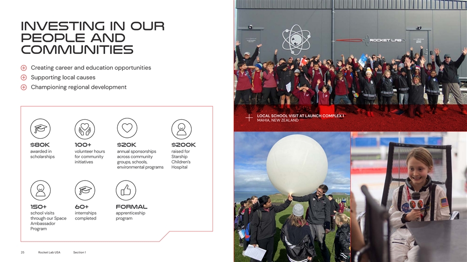 Investing in our people and communities Creating career and education opportunities Supporting local causes Championing regional development LOCAL SCHOOL VISIT AT LAUNCH COMPLEX 1 MAHIA, NEW ZEALAND $80K 100+ $20k $200k awarded in volunteer hours annual sponsorships raised for scholarships for community across community Starship initiatives groups, schools, Children’s environmental programs Hospital 150+ 60+ FORMAL school visits internships apprenticeship through our Space completed program Ambassador Program 25 Rocket Lab USA Section 1Investing in our people and communities Creating career and education opportunities Supporting local causes Championing regional development LOCAL SCHOOL VISIT AT LAUNCH COMPLEX 1 MAHIA, NEW ZEALAND $80K 100+ $20k $200k awarded in volunteer hours annual sponsorships raised for scholarships for community across community Starship initiatives groups, schools, Children’s environmental programs Hospital 150+ 60+ FORMAL school visits internships apprenticeship through our Space completed program Ambassador Program 25 Rocket Lab USA Section 1