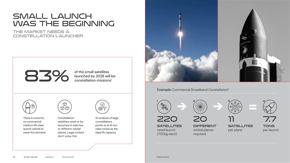 Small Launch was the beginning The market needs a constellation LAUNCHER of the small satellites launched by 2028 will be 1 83% constellation missions 2 Example: Commercial Broadband Constellation 1 2 3 4 8t There is currently Constellation An analysis of large 220 20 11 7.7 no commercial satellites need to be constellations medium lift class launched in batches points to an 8-ton Satellites Different SATELLITES TONS launch vehicle to to different orbital class rocket as the need launch orbital planes per plane per launch meet this demand planes. Large rockets ideal lift capacity (700kg each) required don’t solve this 26 Rocket Lab USA Section 2 1 Euroconsult 2 Space NewsSmall Launch was the beginning The market needs a constellation LAUNCHER of the small satellites launched by 2028 will be 1 83% constellation missions 2 Example: Commercial Broadband Constellation 1 2 3 4 8t There is currently Constellation An analysis of large 220 20 11 7.7 no commercial satellites need to be constellations medium lift class launched in batches points to an 8-ton Satellites Different SATELLITES TONS launch vehicle to to different orbital class rocket as the need launch orbital planes per plane per launch meet this demand planes. Large rockets ideal lift capacity (700kg each) required don’t solve this 26 Rocket Lab USA Section 2 1 Euroconsult 2 Space News