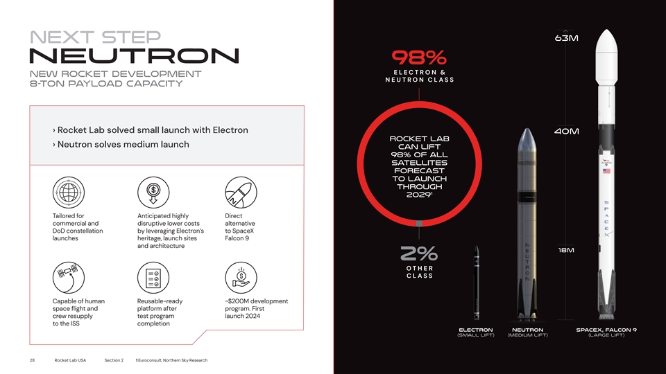 63M Next Step 98% E LECT RO N & NEW ROCKET DEVELOPMENT N E UT RO N C L AS S 8-Ton PAYLOAD CAPACITY › Rocket Lab solved small launch with Electron 40M Rocket Lab › Neutr on solves medium launch can lift 98% of all satellites forecast to launch through 1 2029 Tailored for Anticipated highly Direct commercial and disruptive lower costs alternative DoD constellation by leveraging Electron’s to SpaceX launches heritage, launch sites Falcon 9 and architecture 18M 2% OT H E R C L AS S Capable of human Reusable-ready ~$200M development space flight and platform after program. First crew resupply test program launch 2024 to the ISS completion ELECTRON NEUTRON SPaceX, FALCon 9 (SMALL LIFT) (MEDIUM LIFT) (LARGE LIFT) 28 Rocket Lab USA Section 2 1 Euroconsult, Northern Sky Research63M Next Step 98% E LECT RO N & NEW ROCKET DEVELOPMENT N E UT RO N C L AS S 8-Ton PAYLOAD CAPACITY › Rocket Lab solved small launch with Electron 40M Rocket Lab › Neutr on solves medium launch can lift 98% of all satellites forecast to launch through 1 2029 Tailored for Anticipated highly Direct commercial and disruptive lower costs alternative DoD constellation by leveraging Electron’s to SpaceX launches heritage, launch sites Falcon 9 and architecture 18M 2% OT H E R C L AS S Capable of human Reusable-ready ~$200M development space flight and platform after program. First crew resupply test program launch 2024 to the ISS completion ELECTRON NEUTRON SPaceX, FALCon 9 (SMALL LIFT) (MEDIUM LIFT) (LARGE LIFT) 28 Rocket Lab USA Section 2 1 Euroconsult, Northern Sky Research