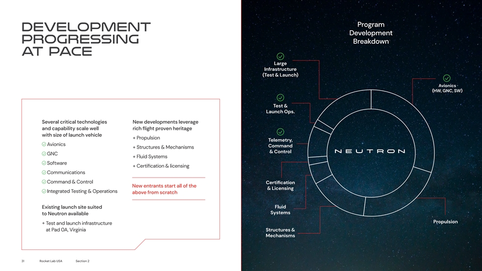 Program Development Development Progressing Breakdown at Pace Large Infrastructure (Test & Launch) Avionics (HW, GNC, SW) Test & Launch Ops. Several critical technologies New developments leverage and capability scale well rich flight proven heritage with size of launch vehicle + Propulsion Telemetry, Avionics Command + Structures & Mechanisms & Control GNC + Fluid Systems Software + Certic fi ation & licensing Communications Command & Control Certic fi ation New entrants start all of the & Licensing Integrated Testing & Operations above from scratch Fluid Existing launch site suited Systems to Neutron available Propulsion + Test and launch infrastructure at Pad 0A, Virginia Structures & Mechanisms 31 Rocket Lab USA Section 2Program Development Development Progressing Breakdown at Pace Large Infrastructure (Test & Launch) Avionics (HW, GNC, SW) Test & Launch Ops. Several critical technologies New developments leverage and capability scale well rich flight proven heritage with size of launch vehicle + Propulsion Telemetry, Avionics Command + Structures & Mechanisms & Control GNC + Fluid Systems Software + Certic fi ation & licensing Communications Command & Control Certic fi ation New entrants start all of the & Licensing Integrated Testing & Operations above from scratch Fluid Existing launch site suited Systems to Neutron available Propulsion + Test and launch infrastructure at Pad 0A, Virginia Structures & Mechanisms 31 Rocket Lab USA Section 2