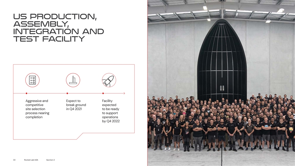 US PRODUCTION, Assembly, Integration and Test FACILITY Aggressive and Expect to Facility competitive break ground expected site selection in Q4 2021 to be ready process nearing to support completion operations by Q4 2022 33 Rocket Lab USA Section 2US PRODUCTION, Assembly, Integration and Test FACILITY Aggressive and Expect to Facility competitive break ground expected site selection in Q4 2021 to be ready process nearing to support completion operations by Q4 2022 33 Rocket Lab USA Section 2