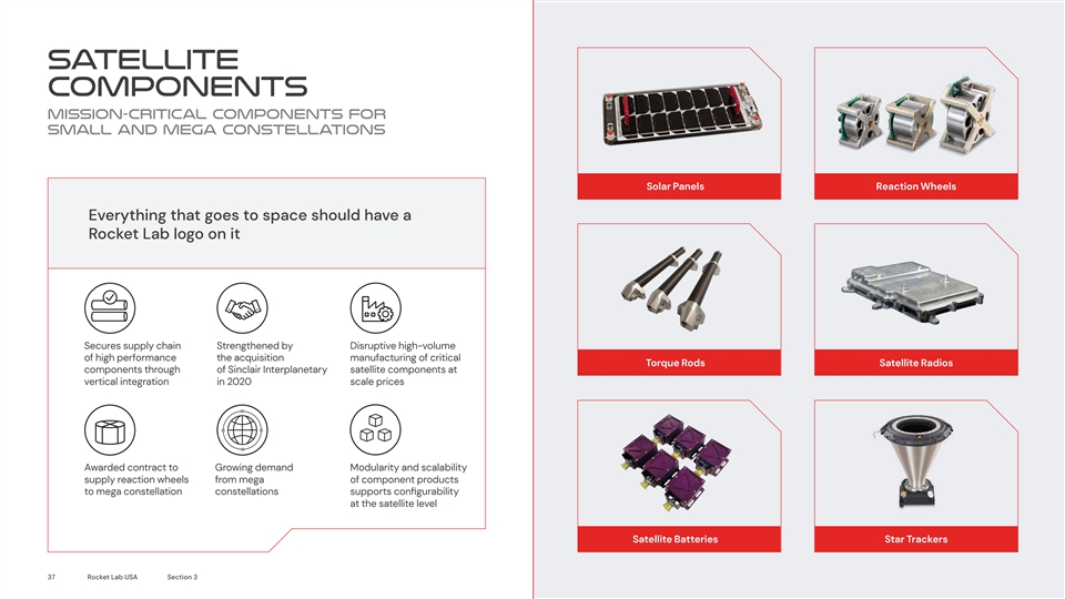 Satellite Components Mission-critical components for small and mega constellations Solar Panels Reaction Wheels Everything that goes to space should have a Rocket Lab logo on it Secures supply chain Strengthened by Disruptive high-volume of high performance the acquisition manufacturing of critical Torque Rods Satellite Radios components through of Sinclair Interplanetary satellite components at vertical integration in 2020 scale prices Awarded contract to Growing demand Modularity and scalability supply reaction wheels from mega of component products to mega constellation constellations supports configurability at the satellite level Satellite Batteries Star Trackers 37 Rocket Lab USA Section 3Satellite Components Mission-critical components for small and mega constellations Solar Panels Reaction Wheels Everything that goes to space should have a Rocket Lab logo on it Secures supply chain Strengthened by Disruptive high-volume of high performance the acquisition manufacturing of critical Torque Rods Satellite Radios components through of Sinclair Interplanetary satellite components at vertical integration in 2020 scale prices Awarded contract to Growing demand Modularity and scalability supply reaction wheels from mega of component products to mega constellation constellations supports configurability at the satellite level Satellite Batteries Star Trackers 37 Rocket Lab USA Section 3