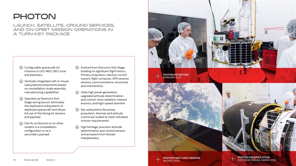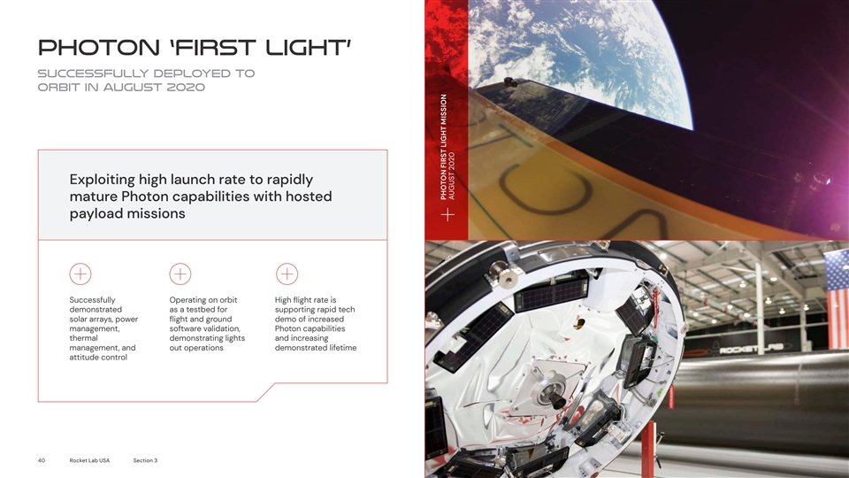 Space Systems MANDATE Satellites 1 as a Service From LEO constellations to high-complexity deep space and interplanetary missions Satellite 2 COMPONENTS Anything that goes to space should have a Rocket Lab logo on it SPACE 3 APPLICATIONS Uniquely positioned to access expanding space applications TAM 36 Rocket Lab USA Section 3 PHOTON PATHFINDER 1 AUGUST 2020 PHOTON - CAPSTONE AUGUST 2020Space Systems MANDATE Satellites 1 as a Service From LEO constellations to high-complexity deep space and interplanetary missions Satellite 2 COMPONENTS Anything that goes to space should have a Rocket Lab logo on it SPACE 3 APPLICATIONS Uniquely positioned to access expanding space applications TAM 36 Rocket Lab USA Section 3 PHOTON PATHFINDER 1 AUGUST 2020 PHOTON - CAPSTONE AUGUST 2020