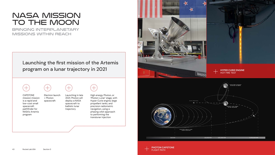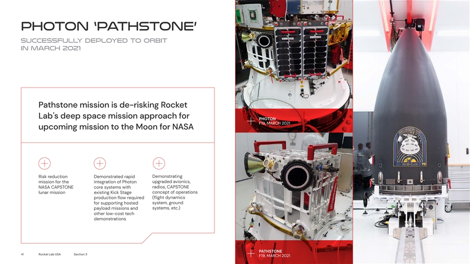 PHOTON ‘PATHSTONE’ Successfully deployed to orbit in March 2021 Pathstone mission is de-risking Rocket Lab's deep space mission approach for PHOTON F19, MARCH 2021 upcoming mission to the Moon for NASA Risk reduction Demonstrated rapid Demonstrating mission for the integration of Photon upgraded avionics, radios, CAPSTONE NASA CAPSTONE core systems with concept of operations lunar mission existing Kick Stage (flight dynamics production flow required for supporting hosted system, ground payload missions and systems, etc.) other low-cost tech demonstrations PATHSTONE 41 Rocket Lab USA Section 3 F19, MARCH 2021PHOTON ‘PATHSTONE’ Successfully deployed to orbit in March 2021 Pathstone mission is de-risking Rocket Lab's deep space mission approach for PHOTON F19, MARCH 2021 upcoming mission to the Moon for NASA Risk reduction Demonstrated rapid Demonstrating mission for the integration of Photon upgraded avionics, radios, CAPSTONE NASA CAPSTONE core systems with concept of operations lunar mission existing Kick Stage (flight dynamics production flow required for supporting hosted system, ground payload missions and systems, etc.) other low-cost tech demonstrations PATHSTONE 41 Rocket Lab USA Section 3 F19, MARCH 2021