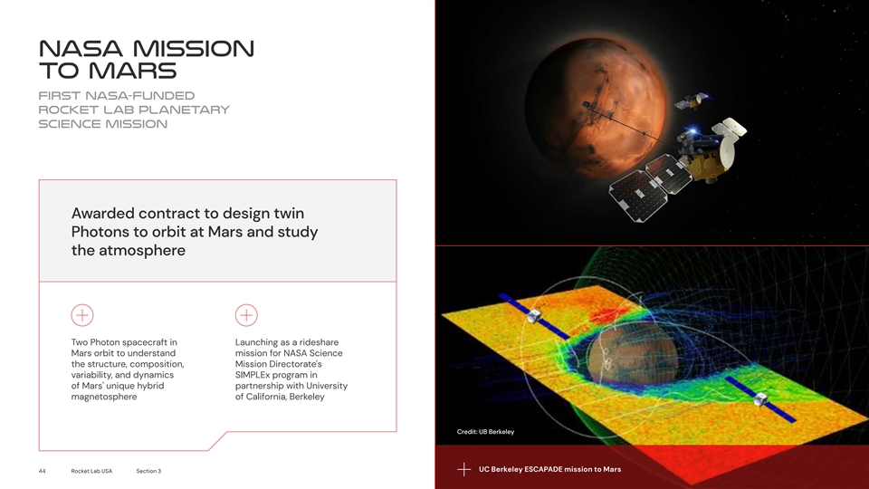 NASA Mission to Mars First NASA-funded Rocket Lab planetary science mission Awarded contract to design twin Photons to orbit at Mars and study the atmosphere Two Photon spacecraft in Launching as a rideshare Mars orbit to understand mission for NASA Science the structure, composition, Mission Directorate's variability, and dynamics SIMPLEx program in of Mars' unique hybrid partnership with University magnetosphere of California, Berkeley Credit: UB Berkeley UC Berkeley ESCAPADE mission to Mars 44 Rocket Lab USA Section 3NASA Mission to Mars First NASA-funded Rocket Lab planetary science mission Awarded contract to design twin Photons to orbit at Mars and study the atmosphere Two Photon spacecraft in Launching as a rideshare Mars orbit to understand mission for NASA Science the structure, composition, Mission Directorate's variability, and dynamics SIMPLEx program in of Mars' unique hybrid partnership with University magnetosphere of California, Berkeley Credit: UB Berkeley UC Berkeley ESCAPADE mission to Mars 44 Rocket Lab USA Section 3