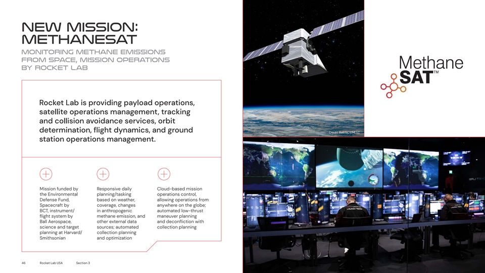 New Mission: Methanesat Monitoring methane emissions from space, Mission Operations by Rocket Lab Rocket Lab is providing payload operations, satellite operations management, tracking and collision avoidance services, orbit determination, flight dynamics, and ground Credit: Ball/BCT/MLLC station operations management. Mission funded by Responsive daily Cloud-based mission the Environmental planning/tasking operations control, Defense Fund, based on weather, allowing operations from Spacecraft by coverage, changes anywhere on the globe; BCT, instrument/ in anthropogenic automated low-thrust flight system by methane emission, and maneuver planning Ball Aerospace, other external data and deconfliction with science and target sources; automated collection planning planning at Harvard/ collection planning Smithsonian and optimization 46 Rocket Lab USA Section 3New Mission: Methanesat Monitoring methane emissions from space, Mission Operations by Rocket Lab Rocket Lab is providing payload operations, satellite operations management, tracking and collision avoidance services, orbit determination, flight dynamics, and ground Credit: Ball/BCT/MLLC station operations management. Mission funded by Responsive daily Cloud-based mission the Environmental planning/tasking operations control, Defense Fund, based on weather, allowing operations from Spacecraft by coverage, changes anywhere on the globe; BCT, instrument/ in anthropogenic automated low-thrust flight system by methane emission, and maneuver planning Ball Aerospace, other external data and deconfliction with science and target sources; automated collection planning planning at Harvard/ collection planning Smithsonian and optimization 46 Rocket Lab USA Section 3