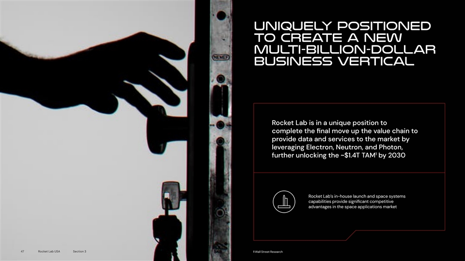Uniquely positioned to create a new multi-billion-dollar business vertical Rocket Lab is in a unique position to complete the final move up the value chain to provide data and services to the market by leveraging Electron, Neutron, and Photon, 1 further unlocking the ~$1.4T TAM by 2030 Rocket Lab’s in-house launch and space systems capabilities provide signic fi ant competitive advantages in the space applications market 47 Rocket Lab USA Section 3 1 Wall Street ResearchUniquely positioned to create a new multi-billion-dollar business vertical Rocket Lab is in a unique position to complete the final move up the value chain to provide data and services to the market by leveraging Electron, Neutron, and Photon, 1 further unlocking the ~$1.4T TAM by 2030 Rocket Lab’s in-house launch and space systems capabilities provide signic fi ant competitive advantages in the space applications market 47 Rocket Lab USA Section 3 1 Wall Street Research