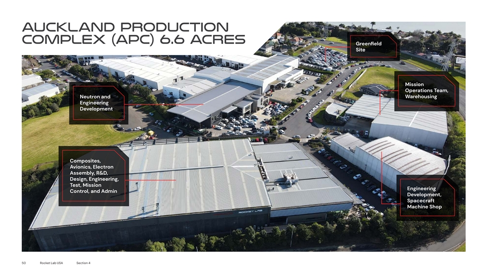 AUCKLAND PRODUCTION COMPLEX (APC) 6.6 ACRES Greenfield Site Mission Operations Team, Warehousing Neutron and Engineering Development Composites, Avionics, Electron Assembly, R&D, Design, Engineering, Test, Mission Engineering Control, and Admin Development, Spacecraft Machine Shop 50 Rocket Lab USA Section 4AUCKLAND PRODUCTION COMPLEX (APC) 6.6 ACRES Greenfield Site Mission Operations Team, Warehousing Neutron and Engineering Development Composites, Avionics, Electron Assembly, R&D, Design, Engineering, Test, Mission Engineering Control, and Admin Development, Spacecraft Machine Shop 50 Rocket Lab USA Section 4