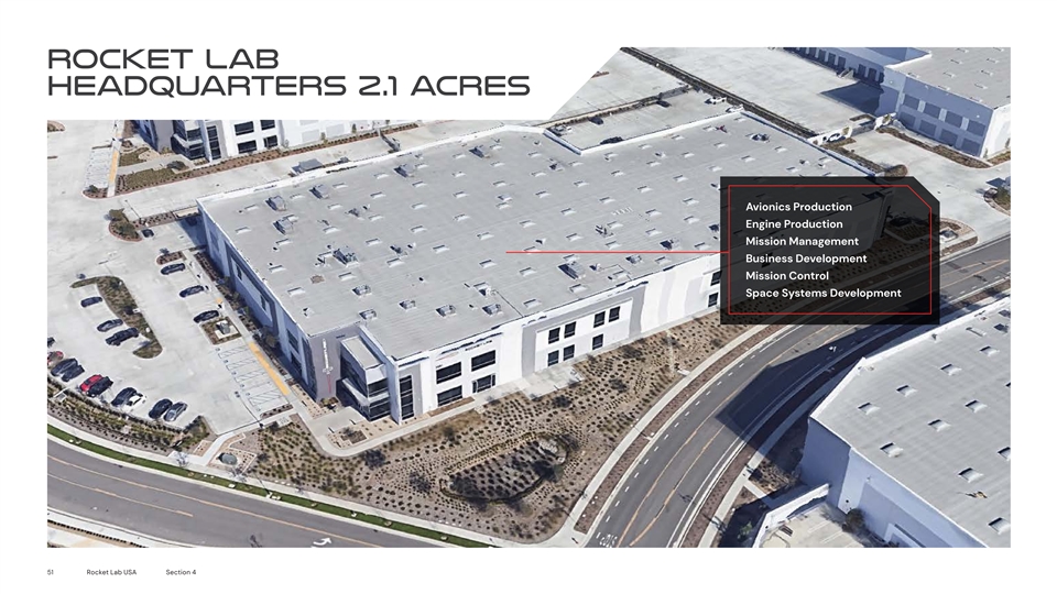 Rocket Lab Headquarters 2.1 acres Avionics Production Engine Production Mission Management Business Development Mission Control Space Systems Development 51 Rocket Lab USA Section 4Rocket Lab Headquarters 2.1 acres Avionics Production Engine Production Mission Management Business Development Mission Control Space Systems Development 51 Rocket Lab USA Section 4