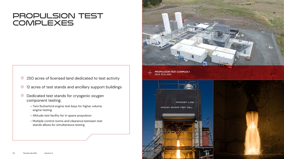 PROPULSION TEST COMPLEXES PROPULSION TEST COMPLEX 1 NEW ZEALAND 250 acres of licensed land dedicated to test activity 12 acres of test stands and ancillary support buildings Dedicated test stands for cryogenic oxygen component testing: – T win Rutherford engine test bays for higher volume engine testing – Altitude test facility for in space propulsion – Multiple contr ol rooms and clearance between test stands allows for simultaneous testing 52 Rocket Lab USA Section 4