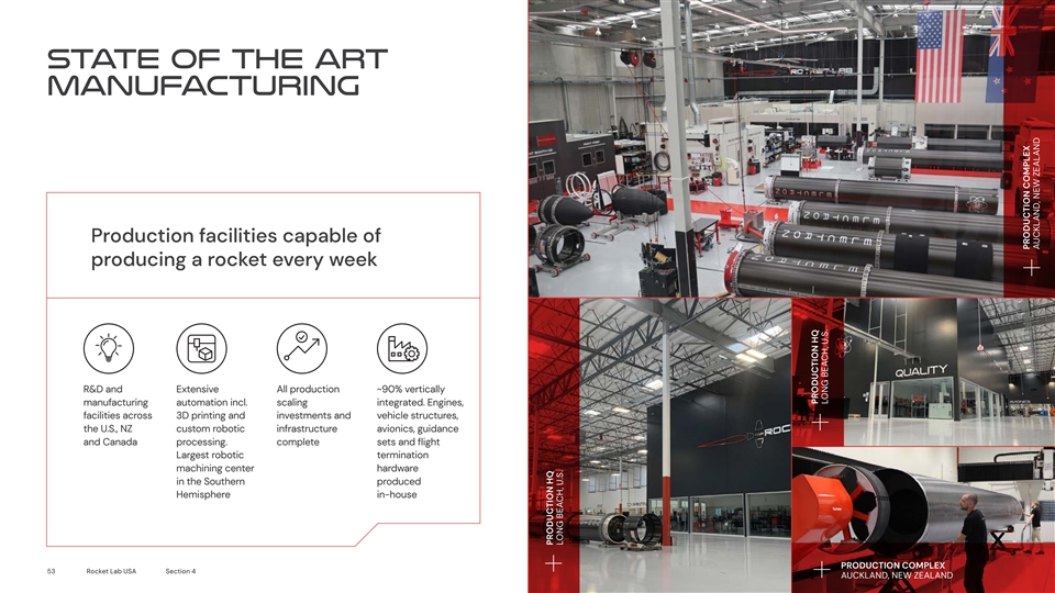 STATE OF THE ART MANUFACTURING Production facilities capable of producing a rocket every week R&D and Extensive All production ~90% vertically manufacturing automation incl. scaling integrated. Engines, facilities across 3D printing and investments and vehicle structures, the U.S., NZ custom robotic infrastructure avionics, guidance and Canada processing. complete sets and flight Largest robotic termination machining center hardware in the Southern produced Hemisphere in-house PRODUCTION COMPLEX 53 Rocket Lab USA Section 4 AUCKLAND, NEW ZEALAND PRODUCTION HQ LONG BEACH, U.S. PRODUCTION HQ LONG BEACH, U.S. PRODUCTION COMPLEX AUCKLAND, NEW ZEALANDSTATE OF THE ART MANUFACTURING Production facilities capable of producing a rocket every week R&D and Extensive All production ~90% vertically manufacturing automation incl. scaling integrated. Engines, facilities across 3D printing and investments and vehicle structures, the U.S., NZ custom robotic infrastructure avionics, guidance and Canada processing. complete sets and flight Largest robotic termination machining center hardware in the Southern produced Hemisphere in-house PRODUCTION COMPLEX 53 Rocket Lab USA Section 4 AUCKLAND, NEW ZEALAND PRODUCTION HQ LONG BEACH, U.S. PRODUCTION HQ LONG BEACH, U.S. PRODUCTION COMPLEX AUCKLAND, NEW ZEALAND