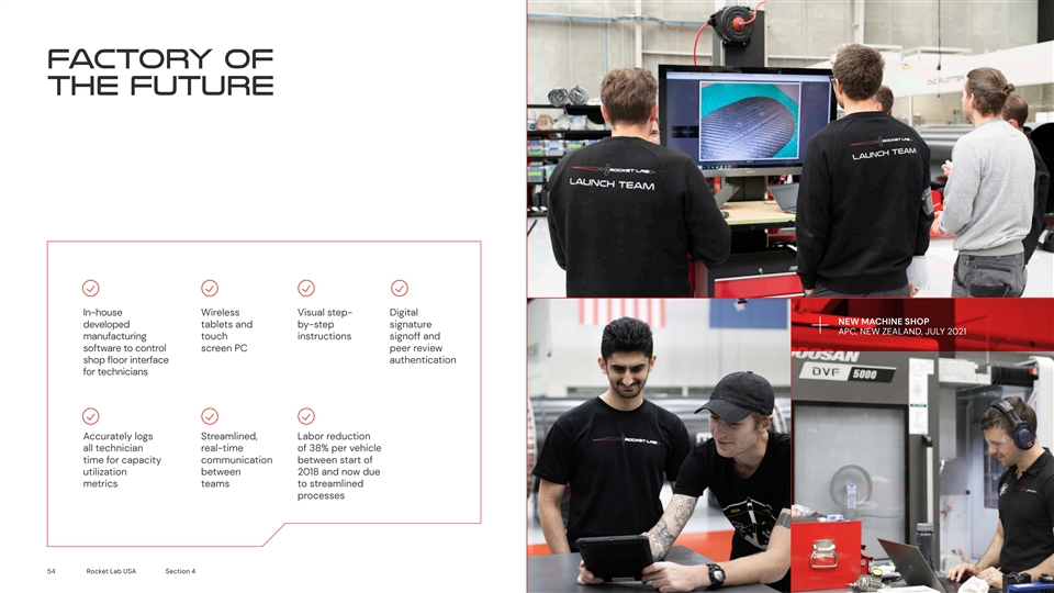 factory of the future In-house Wireless Visual step- Digital NEW MACHINE SHOP developed tablets and by-step signature APC, NEW ZEALAND, JULY 2021 manufacturing touch instructions signoff and software to control screen PC peer review shop floor interface authentication for technicians Accurately logs Streamlined, Labor reduction all technician real-time of 38% per vehicle time for capacity communication between start of utilization between 2018 and now due metrics teams to streamlined processes 54 Rocket Lab USA Section 4factory of the future In-house Wireless Visual step- Digital NEW MACHINE SHOP developed tablets and by-step signature APC, NEW ZEALAND, JULY 2021 manufacturing touch instructions signoff and software to control screen PC peer review shop floor interface authentication for technicians Accurately logs Streamlined, Labor reduction all technician real-time of 38% per vehicle time for capacity communication between start of utilization between 2018 and now due metrics teams to streamlined processes 54 Rocket Lab USA Section 4