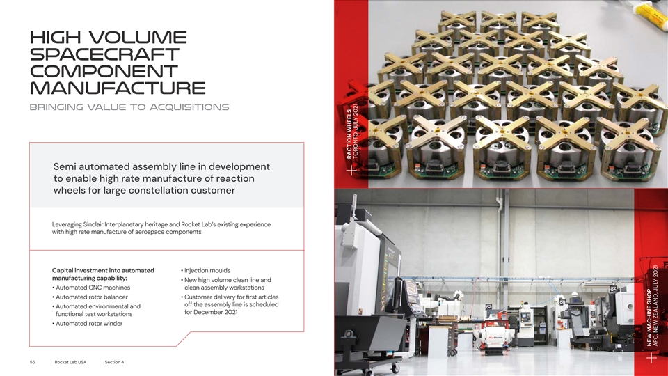 High Volume Spacecraft Component Manufacture Bringing Value to Acquisitions Semi automated assembly line in development to enable high rate manufacture of reaction wheels for large constellation customer Leveraging Sinclair Interplanetary heritage and Rocket Lab’s existing experience with high rate manufacture of aerospace components Capital investment into automated • Injection moulds manufacturing capability: • New high volume clean line and • Automated CNC machines clean assembly workstations • Automated rotor balancer • Cus tomer delivery for first articles off the assembly line is scheduled • A utomated environmental and for December 2021 functional test workstations • Automated rotor winder 55 Rocket Lab USA Section 4 RACTION WHEELS TORONTO, JULY 2021 NEW MACHINE SHOP APC, NEW ZEALAND, JULY 2021High Volume Spacecraft Component Manufacture Bringing Value to Acquisitions Semi automated assembly line in development to enable high rate manufacture of reaction wheels for large constellation customer Leveraging Sinclair Interplanetary heritage and Rocket Lab’s existing experience with high rate manufacture of aerospace components Capital investment into automated • Injection moulds manufacturing capability: • New high volume clean line and • Automated CNC machines clean assembly workstations • Automated rotor balancer • Cus tomer delivery for first articles off the assembly line is scheduled • A utomated environmental and for December 2021 functional test workstations • Automated rotor winder 55 Rocket Lab USA Section 4 RACTION WHEELS TORONTO, JULY 2021 NEW MACHINE SHOP APC, NEW ZEALAND, JULY 2021