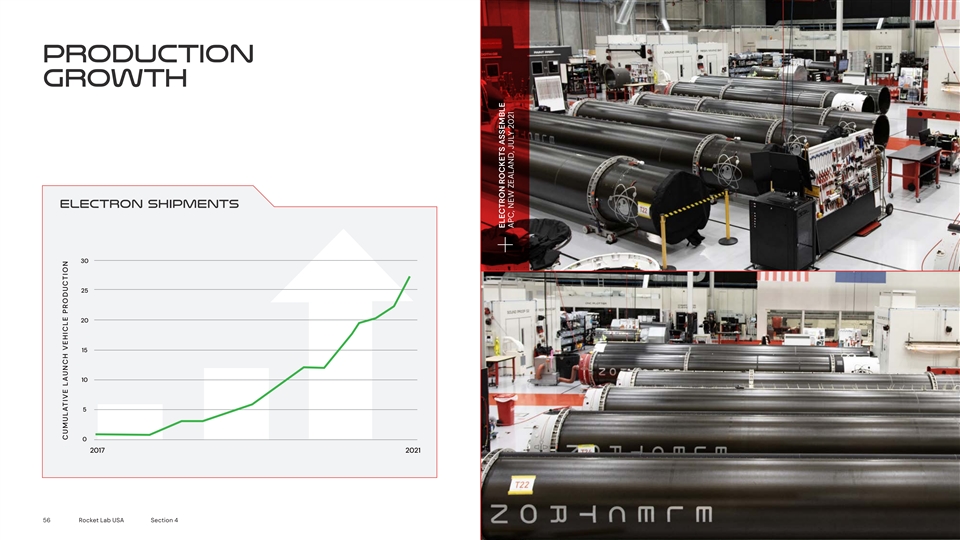 Production Growth ELECTRON SHIPMENTS 30 25 20 15 10 5 0 2017 2021 56 Rocket Lab USA Section 4 CUMULATIVE LAUNCH VEHICLE PRODUCTION ELECTRON ROCKETS ASSEMBLE APC, NEW ZEALAND, JULY 2021Production Growth ELECTRON SHIPMENTS 30 25 20 15 10 5 0 2017 2021 56 Rocket Lab USA Section 4 CUMULATIVE LAUNCH VEHICLE PRODUCTION ELECTRON ROCKETS ASSEMBLE APC, NEW ZEALAND, JULY 2021