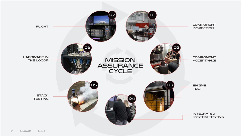 07 01 Component Flight Inspection 06 02 Hardware in Component The Loo0p Acceptance MISSION ASSURANCE CYCLE 05 03 Engine Test Stack Testing 04 Integrated System Testing 57 Rocket Lab USA Section 407 01 Component Flight Inspection 06 02 Hardware in Component The Loo0p Acceptance MISSION ASSURANCE CYCLE 05 03 Engine Test Stack Testing 04 Integrated System Testing 57 Rocket Lab USA Section 4