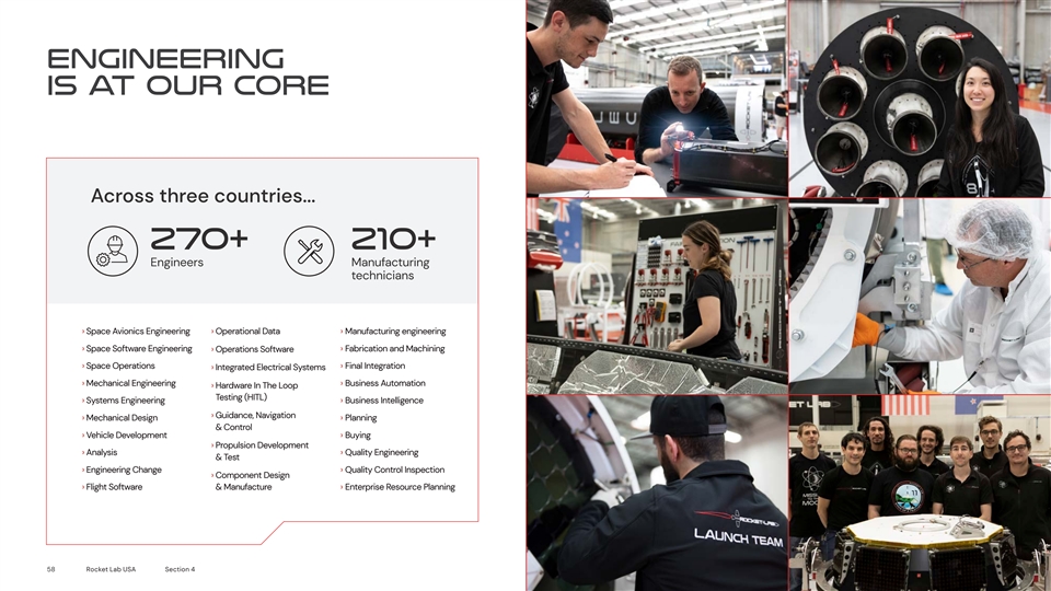 Engineering is at our core Across three countries... 270+ 210+ Engineers Manufacturing technicians › Space Avionics Engineering › Operational Data › Manufacturing engineering › Space Software Engineering › Fabrication and Machining › Operations Software › Space Operations › Final Integration › Integrated Electrical Systems › Mechanical Engineering › Business Automation › Hardware In The Loop Testing (HITL) › Systems Engineering › Business Intelligence › Guidance, Na vigation › Mechanical Design › Planning & Control › Vehicle Development › Buying › Pr opulsion Development › Analysis › Quality Engineering & Test › Engineering Change › Quality Control Inspection › Component Design › Flight Software & Manufacture › Enterprise Resource Planning 58 Rocket Lab USA Section 4Engineering is at our core Across three countries... 270+ 210+ Engineers Manufacturing technicians › Space Avionics Engineering › Operational Data › Manufacturing engineering › Space Software Engineering › Fabrication and Machining › Operations Software › Space Operations › Final Integration › Integrated Electrical Systems › Mechanical Engineering › Business Automation › Hardware In The Loop Testing (HITL) › Systems Engineering › Business Intelligence › Guidance, Na vigation › Mechanical Design › Planning & Control › Vehicle Development › Buying › Pr opulsion Development › Analysis › Quality Engineering & Test › Engineering Change › Quality Control Inspection › Component Design › Flight Software & Manufacture › Enterprise Resource Planning 58 Rocket Lab USA Section 4