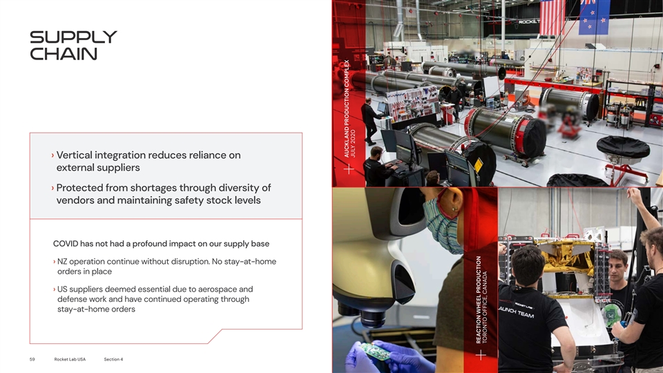 SUPPLY CHAIN › V ertical integration reduces reliance on external suppliers › Pr otected from shortages through diversity of vendors and maintaining safety stock levels COVID has not had a profound impact on our supply base › NZ opera tion continue without disruption. No stay-at-home orders in place › US suppliers deemed essential due t o aerospace and defense work and have continued operating through stay-at-home orders 59 Rocket Lab USA Section 4 AUCKLAND PRODUCTION COMPLEX JULY 2020 REACTION WHEEL PRODUCTION TORONTO OFFICE, CANADA