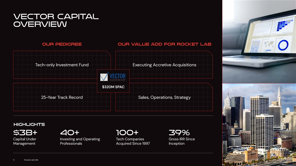 Vector Capital Overview OUR PEDIGREE Our Value Add for Rocket Lab Tech-only Investment Fund Executing Accretive Acquisitions $320M SPAC 25-Year Track Record Sales, Operations, Strategy HIGHLIGHTS $3B+ 40+ 100+ 39% Capital Under Investing and Operating Tech Companies Gross IRR Since Management Professionals Acquired Since 1997 Inception 5 Rocket Lab USA Vector Capital Overview OUR PEDIGREE Our Value Add for Rocket Lab Tech-only Investment Fund Executing Accretive Acquisitions $320M SPAC 25-Year Track Record Sales, Operations, Strategy HIGHLIGHTS $3B+ 40+ 100+ 39% Capital Under Investing and Operating Tech Companies Gross IRR Since Management Professionals Acquired Since 1997 Inception 5 Rocket Lab USA