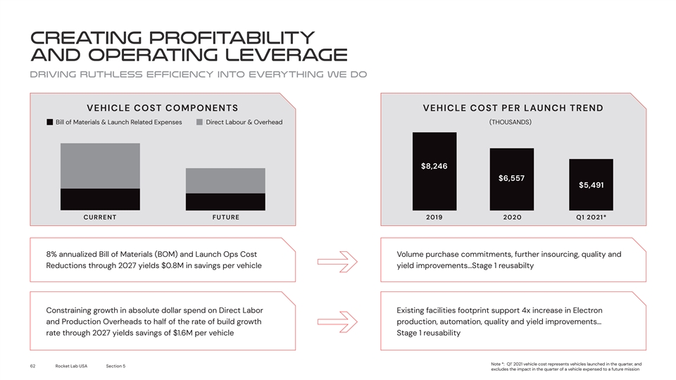 Creating Profitability and Operating Leverage Driving ruthless efficiency into everything we do VEHICLE COST COMPONENTS VEHICLE COST PER LAUNCH TREND Bill of Materials & Launch Related Expenses Direct Labour & Overhead (THOUSANDS) $8,246 $6,557 $5,491 CURRENT FUTURE 2019 2020 Q1 2021* 8% annualized Bill of Materials (BOM) and Launch Ops Cost Volume purchase commitments, further insourcing, quality and Reductions through 2027 yields $0.8M in savings per vehicle yield improvements…Stage 1 reusabilty Constraining growth in absolute dollar spend on Direct Labor Existing facilities footprint support 4x increase in Electron and Production Overheads to half of the rate of build growth production, automation, quality and yield improvements… rate through 2027 yields savings of $1.6M per vehicle Stage 1 reusability Note *: Q1’ 2021 vehicle cost represents vehicles launched in the quarter, and 62 Rocket Lab USA Section 5 excludes the impact in the quarter of a vehicle expensed to a future mission Creating Profitability and Operating Leverage Driving ruthless efficiency into everything we do VEHICLE COST COMPONENTS VEHICLE COST PER LAUNCH TREND Bill of Materials & Launch Related Expenses Direct Labour & Overhead (THOUSANDS) $8,246 $6,557 $5,491 CURRENT FUTURE 2019 2020 Q1 2021* 8% annualized Bill of Materials (BOM) and Launch Ops Cost Volume purchase commitments, further insourcing, quality and Reductions through 2027 yields $0.8M in savings per vehicle yield improvements…Stage 1 reusabilty Constraining growth in absolute dollar spend on Direct Labor Existing facilities footprint support 4x increase in Electron and Production Overheads to half of the rate of build growth production, automation, quality and yield improvements… rate through 2027 yields savings of $1.6M per vehicle Stage 1 reusability Note *: Q1’ 2021 vehicle cost represents vehicles launched in the quarter, and 62 Rocket Lab USA Section 5 excludes the impact in the quarter of a vehicle expensed to a future mission