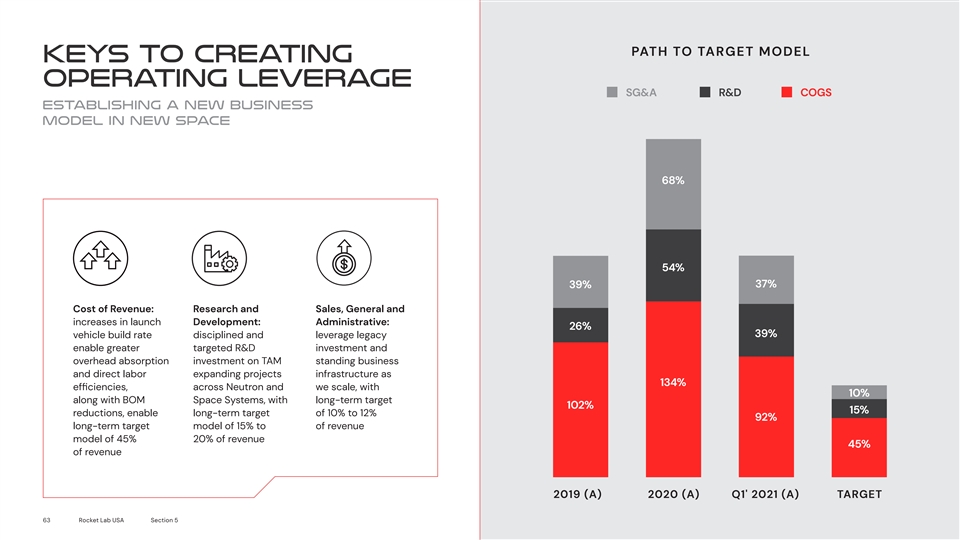 PATH TO TARGET MODEL Keys to creating Operating Leverage SG&A R&D COGS Establishing a new business model in New Space 68% 54% 39% 37% Cost of Revenue: Research and Sales, General and increases in launch Development: Administrative: 26% 39% vehicle build rate disciplined and leverage legacy enable greater targeted R&D investment and overhead absorption investment on TAM standing business and direct labor expanding projects infrastructure as 134% efficiencies, across Neutron and we scale, with 10% along with BOM Space Systems, with long-term target 102% 15% reductions, enable long-term target of 10% to 12% 92% long-term target model of 15% to of revenue model of 45% 20% of revenue 45% of revenue 2019 (A) 2020 (A) Q1' 2021 (A) TARGET 63 Rocket Lab USA Section 5PATH TO TARGET MODEL Keys to creating Operating Leverage SG&A R&D COGS Establishing a new business model in New Space 68% 54% 39% 37% Cost of Revenue: Research and Sales, General and increases in launch Development: Administrative: 26% 39% vehicle build rate disciplined and leverage legacy enable greater targeted R&D investment and overhead absorption investment on TAM standing business and direct labor expanding projects infrastructure as 134% efficiencies, across Neutron and we scale, with 10% along with BOM Space Systems, with long-term target 102% 15% reductions, enable long-term target of 10% to 12% 92% long-term target model of 15% to of revenue model of 45% 20% of revenue 45% of revenue 2019 (A) 2020 (A) Q1' 2021 (A) TARGET 63 Rocket Lab USA Section 5