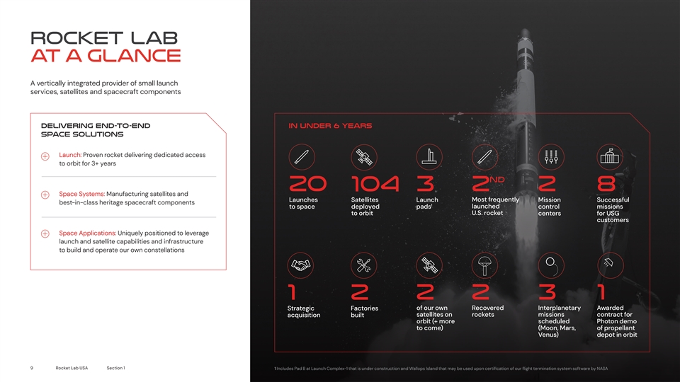 Rocket lab at a glance A vertically integrated provider of small launch services, satellites and spacecraft components Delivering end-to-end IN UNDER 6 YEARS space solutions Launch: Proven rocket delivering dedicated access to orbit for 3+ years ND 20 3 2 2 8 104 Space Systems: Manufacturing satellites and Satellites Most frequently Launches Launch Mission Successful best-in-class heritage spacecraft components 1 to space deployed pads launched control missions to orbit U.S. rocket centers for USG customers Space Applications: Uniquely positioned to leverage launch and satellite capabilities and infrastructure to build and operate our own constellations 2 2 3 1 1 2 of our own Recovered Interplanetary Awarded Strategic Factories acquisition built satellites on rockets missions contract for orbit (+ more scheduled Photon demo to come) (Moon, Mars, of propellant Venus) depot in orbit 9 Rocket Lab USA Section 1 1 Includes Pad B at Launch Complex-1 that is under construction and Wallops Island that may be used upon certification of our flight termination system software by NASARocket lab at a glance A vertically integrated provider of small launch services, satellites and spacecraft components Delivering end-to-end IN UNDER 6 YEARS space solutions Launch: Proven rocket delivering dedicated access to orbit for 3+ years ND 20 3 2 2 8 104 Space Systems: Manufacturing satellites and Satellites Most frequently Launches Launch Mission Successful best-in-class heritage spacecraft components 1 to space deployed pads launched control missions to orbit U.S. rocket centers for USG customers Space Applications: Uniquely positioned to leverage launch and satellite capabilities and infrastructure to build and operate our own constellations 2 2 3 1 1 2 of our own Recovered Interplanetary Awarded Strategic Factories acquisition built satellites on rockets missions contract for orbit (+ more scheduled Photon demo to come) (Moon, Mars, of propellant Venus) depot in orbit 9 Rocket Lab USA Section 1 1 Includes Pad B at Launch Complex-1 that is under construction and Wallops Island that may be used upon certification of our flight termination system software by NASA