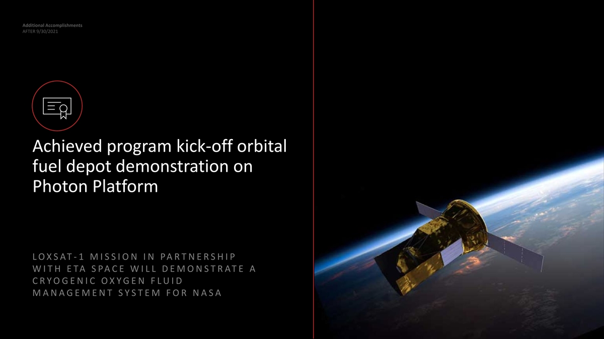 Additional Accomplishments AFTER 9/30/2021 Achieved program kick-off orbital fuel depot demonstration on Photon Platform L O X S AT -1 MISSION IN PARTNERSHIP WITH ETA SPACE WILL DEMONSTRATE A CRYOGENIC OXYGEN FLUID MANAGEMENT SYSTEM FOR NASA