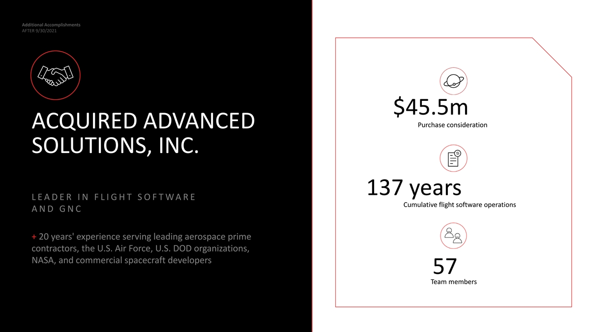 Additional Accomplishments AFTER 9/30/2021 $45.5m Purchase consideration ACQUIRED ADVANCED SOLUTIONS, INC. 137 years LEADER IN FLIGHT S O F TW A RE Cumulative flight software operations AND GNC + 20 years' experience serving leading aerospace prime contractors, the U.S. Air Force, U.S. DOD organizations, NASA, and commercial spacecraft developers 57 Team members