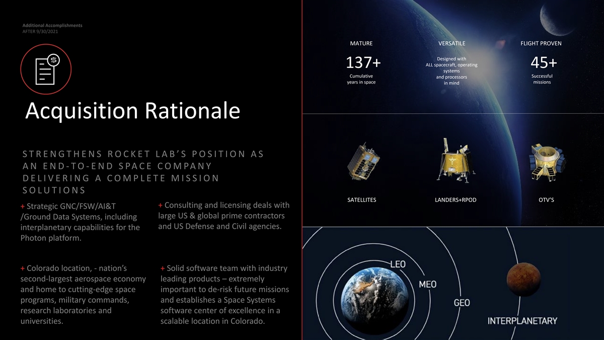 Additional Accomplishments AFTER 9/30/2021 Acquisition Rationale BOLSTERS ROCKET LAB’S END - TO -END SPACE SOLUTIONS ACROSS LAUNCH, SPACECRAFT, SPACE HARDWARE AND MANUFACTURING + Highly valued and strategic + With strategic infrastructure industry partner for global investments enables post customer base and particularly acquisition cost and lead time US Government Customers advancements that will benefit our growing customer base + Provides meaningful cross selling opportunities across component portfolio and active and future launch service agreements