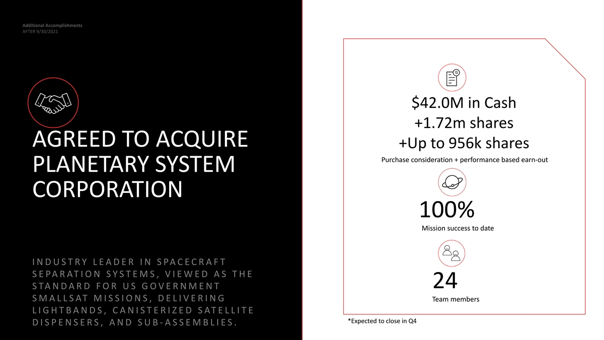 | | Entered into an agreement to acquire Planetary Systems Corporation, a Maryland-based provider of mechanical separation systems and satellite dispensers with 100% mission success heritage to date across more than 100 missions. |