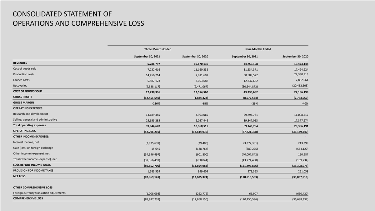 CONSOLIDATED STATEMENT OF OPERATIONS AND COMPREHENSIVE LOSS Three Months Ended Nine Months Ended September 30, 2021 September 30, 2020 September 30, 2021 September 30, 2020 REVENUES 5,286,797 10,670,136 34,759,108 19,423,148 Cost of goods sold 7,232,616 11,160,332 31,234,371 17,424,924 Production costs 22,330,913 14,456,714 7,811,607 30,509,522 Launch costs 7,882,964 5,587,123 3,053,688 12,237,662 Recoveries (20,452,603) (9,538,117) (9,471,067) (30,644,872) COST OF GOODS SOLD 17,738,336 12,554,560 43,336,682 27,186,198 GROSS PROFIT (12,451,540) (1,884,424) (8,577,574) (7,763,050) GROSS MARGIN -236% -18% -25% -40% OPERATING EXPENSES: Research and development 14,189,385 4,903,069 29,796,731 11,008,517 Selling, general and administrative 25,655,285 6,057,446 39,347,053 17,377,674 Total operating expenses 39,844,670 10,960,515 69,143,784 28,386,191 OPERATING LOSS (52,296,210) (12,844,939) (77,721,358) (36,149,240) OTHER INCOME (EXPENSE): - Interest income, net (2,975,639) (29,480) (3,377,381) 213,399 Gain (loss) on foreign exchange 15,645 (128,764) (389,275) (564,120) Other income (expense), net (34,396,497) (601,800) (40,007,842) 190,987 Total Other income (expense), net (37,356,491) (760,044) (43,774,498) (159,734) LOSS BEFORE INCOME TAXES (89,652,700) (13,604,983) (121,495,856) (36,308,975) PROVISION FOR INCOME TAXES 1,683,559 999,609 979,353 251,058 NET LOSS (87,969,141) (12,605,374) (120,516,503) (36,057,916) OTHER COMPREHENSIVE LOSS Foreign currency translation adjustments (1,008,098) (262,776) 65,907 (630,420) COMPREHENSIVE LOSS (88,977,239) (12,868,150) (120,450,596) (36,688,337)