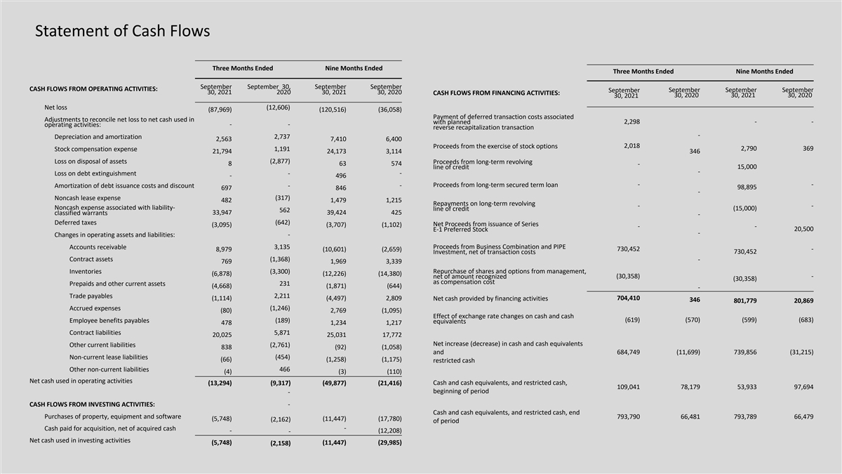 Statement of Cash Flows Three Months Ended Nine Months Ended Three Months Ended Nine Months Ended September September 30, September September CASH FLOWS FROM OPERATING ACTIVITIES: September September September September 30, 2021 2020 30, 2021 30, 2020 CASH FLOWS FROM FINANCING ACTIVITIES: 30, 2020 30, 2021 30, 2020 30, 2021 Net loss (12,606) (87,969) (120,516) (36,058) Payment of deferred transaction costs associated Adjustments to reconcile net loss to net cash used in 2,298 - - with planned - - operating activities: reverse recapitalization transaction - Depreciation and amortization 2,737 2,563 7,410 6,400 Proceeds from the exercise of stock options 2,018 Stock compensation expense 1,191 2,790 369 21,794 24,173 3,114 346 Loss on disposal of assets (2,877) Proceeds from long-term revolving 8 63 574 - line of credit 15,000 - Loss on debt extinguishment - - - 496 Proceeds from long-term secured term loan - - Amortization of debt issuance costs and discount - - 98,895 697 846 - Noncash lease expense (317) 482 1,479 1,215 Repayments on long-term revolving - - Noncash expense associated with liability- line of credit (15,000) 562 classified warrants 33,947 39,424 425 - Deferred taxes (642) Net Proceeds from issuance of Series (3,095) (3,707) (1,102) - - 20,500 E-1 Preferred Stock - Changes in operating assets and liabilities: - Accounts receivable 3,135 Proceeds from Business Combination and PIPE 8,979 (10,601) (2,659) 730,452 - 730,452 Investment, net of transaction costs Contract assets (1,368) - 769 1,969 3,339 Inventories (3,300) Repurchase of shares and options from management, (6,878) (12,226) (14,380) (30,358) - net of amount recognized (30,358) as compensation cost Prepaids and other current assets 231 (4,668) (1,871) (644) - Trade payables 2,211 (1,114) (4,497) 2,809 704,410 Net cash provided by financing activities 346 801,779 20,869 Accrued expenses (1,246) (80) 2,769 (1,095) Effect of exchange rate changes on cash and cash (619) (570) (599) (683) Employee benefits payables (189) equivalents 478 1,234 1,217 Contract liabilities 5,871 20,025 25,031 17,772 Net increase (decrease) in cash and cash equivalents (2,761) Other current liabilities 838 (92) (1,058) and 684,749 (11,699) 739,856 (31,215) (454) Non-current lease liabilities (66) (1,258) (1,175) restricted cash 466 Other non-current liabilities (4) (3) (110) Net cash used in operating activities (13,294) (9,317) (49,877) (21,416) Cash and cash equivalents, and restricted cash, 109,041 78,179 53,933 97,694 beginning of period - CASH FLOWS FROM INVESTING ACTIVITIES: - Cash and cash equivalents, and restricted cash, end Purchases of property, equipment and software 793,790 66,481 793,789 66,479 (5,748) (2,162) (11,447) (17,780) of period - Cash paid for acquisition, net of acquired cash - (12,208) - Net cash used in investing activities (5,748) (11,447) (29,985) (2,158)
