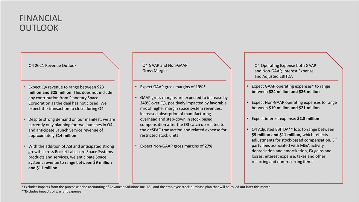 FINANCIAL OUTLOOK Q4 2021 Revenue Outlook Q4 GAAP and Non-GAAP Q4 Operating Expense both GAAP Gross Margins and Non-GAAP, Interest Expense and Adjusted EBITDA • Expect GAAP operating expenses* to range • Expect GAAP gross margins of 13%* • Expect Q4 revenue to range between $23 between $24 million and $26 million million and $25 million. This does not include any contribution from Planetary Space • GAAP gross margins are expected to increase by • Expect Non-GAAP operating expenses to range 249% over Q3, positively impacted by favorable Corporation as the deal has not closed. We between $19 million and $21 million expect the transaction to close during Q4 mix of higher margin space system revenues, increased absorption of manufacturing • Expect interest expense: $2.8 million overhead and step-down in stock based • Despite strong demand on our manifest, we are currently only planning for two launches in Q4 compensation after the Q3 catch up related to • Q4 Adjusted EBITDA** loss to range between the deSPAC transaction and related expense for and anticipate Launch Service revenue of $9 million and $11 million, which reflects approximately $14 million restricted stock units rd adjustments for stock-based compensation, 3 party fees associated with M&A activity, • Expect Non-GAAP gross margins of 27% • With the addition of ASI and anticipated strong depreciation and amortization, FX gains and growth across Rocket Labs core Space Systems losses, interest expense, taxes and other products and services, we anticipate Space recurring and non-recurring items Systems revenue to range between $9 million and $11 million * Excludes impacts from the purchase price accounting of Advanced Solutions Inc (ASI) and the employee stock purchase plan that will be rolled out later this month. **Excludes impacts of warrant expense