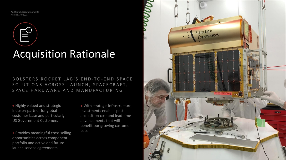 Additional Accomplishments AFTER 9/30/2021 Acquisition Rationale BOLSTERS ROCKET LAB’S END - TO -END SPACE SOLUTIONS ACROSS LAUNCH, SPACECRAFT, SPACE HARDWARE AND MANUFACTURING + Highly valued and strategic + With strategic infrastructure industry partner for global investments enables post customer base and particularly acquisition cost and lead time US Government Customers advancements that will benefit our growing customer base + Provides meaningful cross selling opportunities across component portfolio and active and future launch service agreements