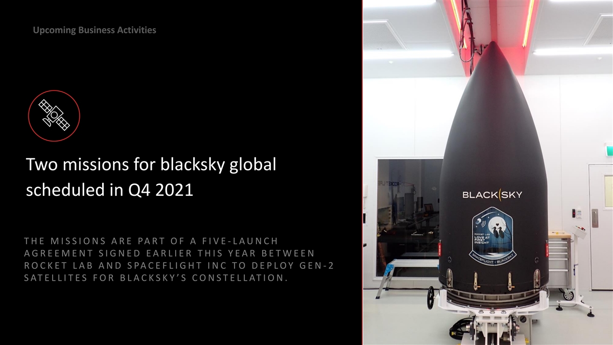 Upcoming Business Activities Two missions for blacksky global scheduled in Q4 2021 THE MISSIONS ARE PART OF A FIVE - L A UN CH AGREEMENT SIGNED EARLIER THIS YEAR BETWEEN ROCKET LAB AND SPACEFLIGHT INC TO DEPLOY GEN - 2 SATELLITES FOR BLACKSKY’S CONSTELLATION.