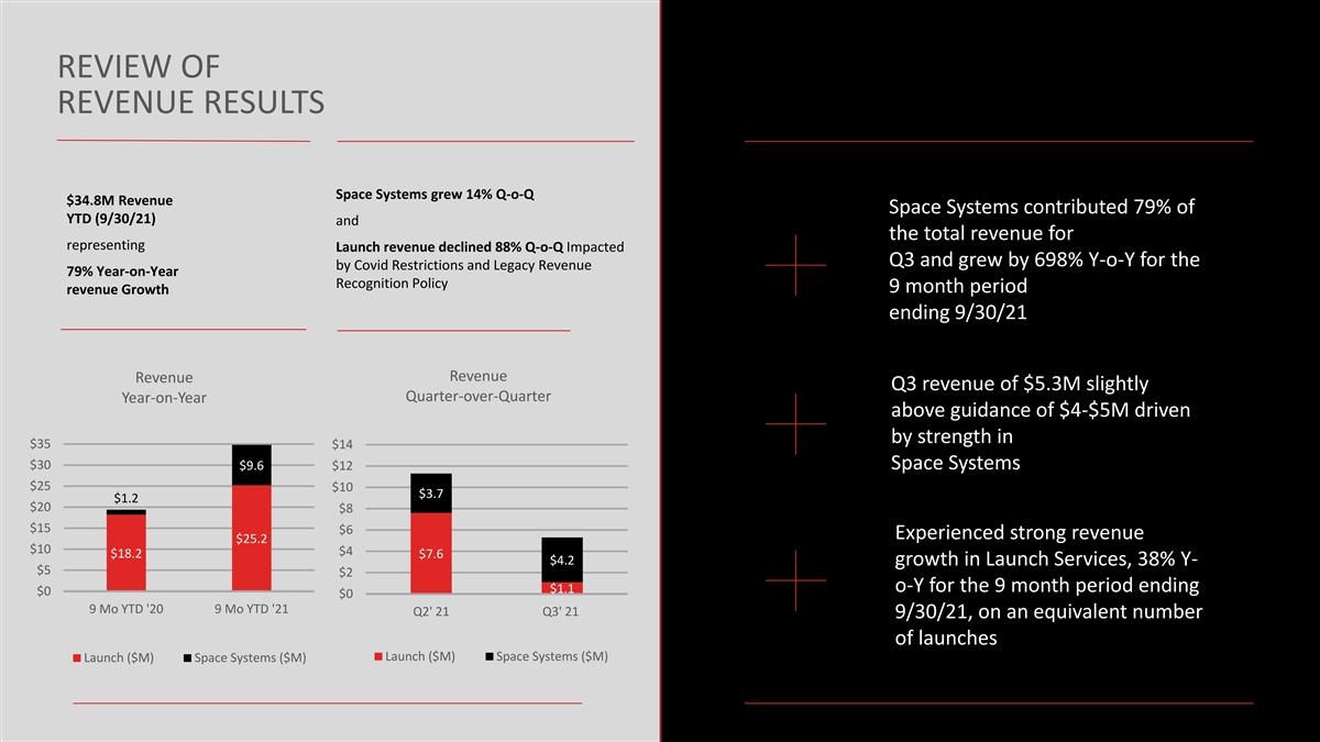 REVIEW OF REVENUE RESULTS Space Systems grew 14% Q-o-Q $34.8M Revenue Space Systems contributed 79% of YTD (9/30/21) and the total revenue for representing Launch revenue declined 88% Q-o-Q Impacted Q3 and grew by 698% Y-o-Y for the by Covid Restrictions and Legacy Revenue 79% Year-on-Year Recognition Policy 9 month period revenue Growth ending 9/30/21 Revenue Revenue Q3 revenue of $5.3M slightly Quarter-over-Quarter Year-on-Year above guidance of $4-$5M driven by strength in $35 $14 $30 $9.6 $12 Space Systems $25 $10 $3.7 $1.2 $20 $8 $15 $6 Experienced strong revenue $25.2 $10 $4 $18.2 $7.6 $4.2 growth in Launch Services, 38% Y- $5 $2 o-Y for the 9 month period ending $1.1 $0 $0 9 Mo YTD '20 9 Mo YTD '21 Q2' 21 Q3' 21 9/30/21, on an equivalent number of launches Launch ($M) Space Systems ($M) Launch ($M) Space Systems ($M)