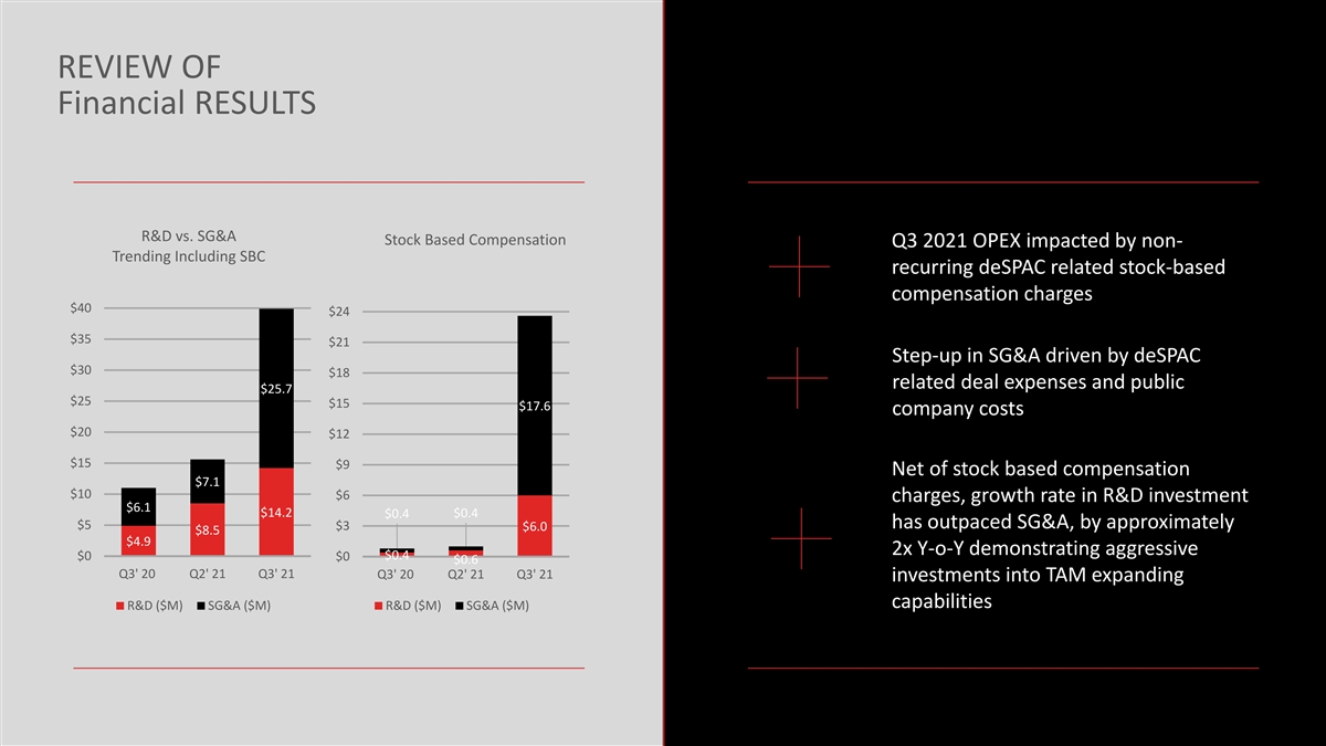 REVIEW OF Financial RESULTS R&D vs. SG&A Stock Based Compensation Q3 2021 OPEX impacted by non- Trending Including SBC recurring deSPAC related stock-based compensation charges $40 $24 $35 $21 Step-up in SG&A driven by deSPAC $30 $18 related deal expenses and public $25.7 $25 $15 $17.6 company costs Chart $20 $12 $15 $9 Net of stock based compensation $7.1 $10 $6 charges, growth rate in R&D investment $6.1 $14.2 $0.4 $0.4 $5 has outpaced SG&A, by approximately $3 $6.0 $8.5 $4.9 2x Y-o-Y demonstrating aggressive $0.4 $0 $0 $0.6 Q3' 20 Q2' 21 Q3' 21 Q3' 20 Q2' 21 Q3' 21 investments into TAM expanding capabilities R&D ($M) SG&A ($M) R&D ($M) SG&A ($M)