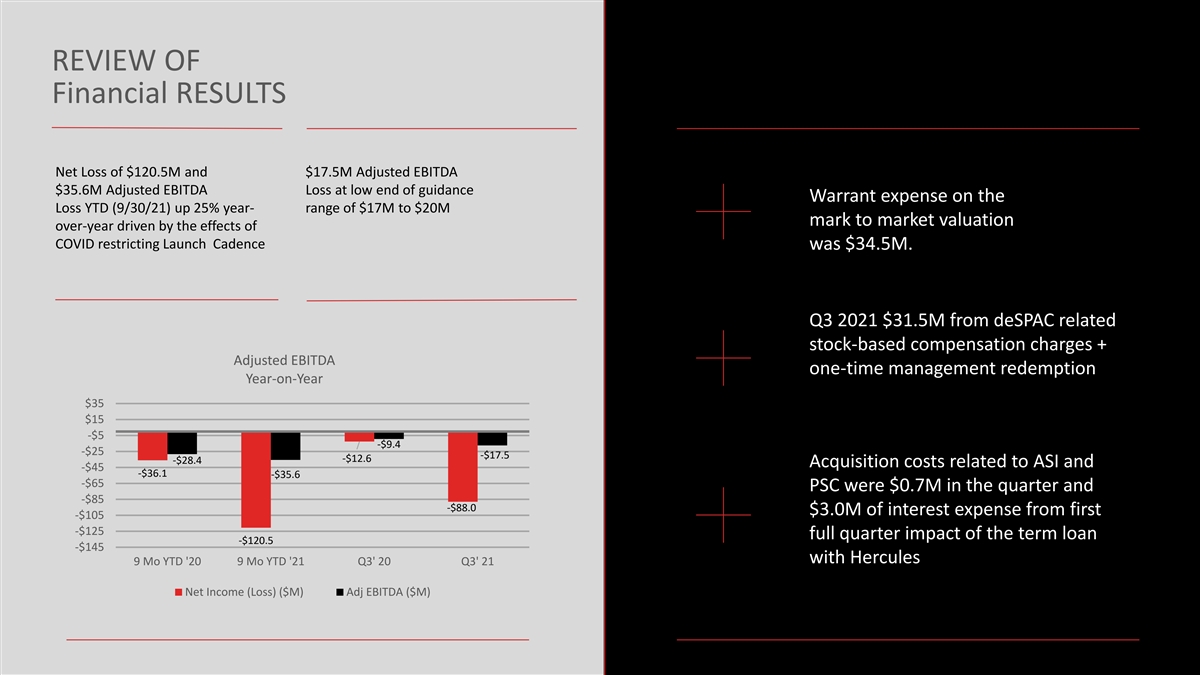 REVIEW OF Financial RESULTS Net Loss of $120.5M and $17.5M Adjusted EBITDA $35.6M Adjusted EBITDA Loss at low end of guidance Warrant expense on the Loss YTD (9/30/21) up 25% year- range of $17M to $20M mark to market valuation over-year driven by the effects of COVID restricting Launch Cadence was $34.5M. Q3 2021 $31.5M from deSPAC related stock-based compensation charges + Adjusted EBITDA one-time management redemption Year-on-Year $35 $15 -$5 -$9.4 -$25 -$17.5 -$12.6 -$28.4 Acquisition costs related to ASI and -$45 -$36.1 -$35.6 -$65 PSC were $0.7M in the quarter and -$85 -$88.0 $3.0M of interest expense from first -$105 -$125 full quarter impact of the term loan -$120.5 -$145 with Hercules 9 Mo YTD '20 9 Mo YTD '21 Q3' 20 Q3' 21 Net Income (Loss) ($M) Adj EBITDA ($M)