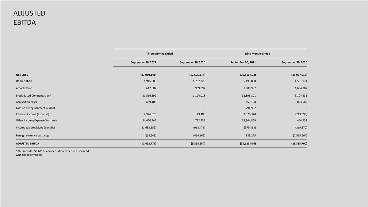 ADJUSTED EBITDA Three Months Ended Nine Months Ended September 30, 2021 September 30, 2020 September 30, 2021 September 30, 2020 NET LOSS (87,969,141) (12,605,374) (120,516,503) (36,057,916) Depreciation 1,945,088 1,767,225 5,499,868 4,591,771 Amortization 617,607 969,097 1,909,997 1,634,387 Stock Based Compensation* 31,516,699 1,194,018 33,895,801 3,104,235 Acquisition costs 659,108 - 659,108 833,505 Loss on extinguishment of debt - - 794,992 - Interest income (expense) 2,976,628 29,480 3,378,370 (213,399) Other Income/Expense Warrants 34,460,445 712,939 39,344,869 454,552 Income tax provisions (benefit) (1,683,559) (968,471) (979,353) (219,870) Foreign currency exchange (15,645) (464,169) 389,275 (2,515,964) ADJUSTED EBITDA (17,492,771) (9,365,254) (35,623,576) (28,388,700) *This includes $9.6M of compensation expense associated with the redemption